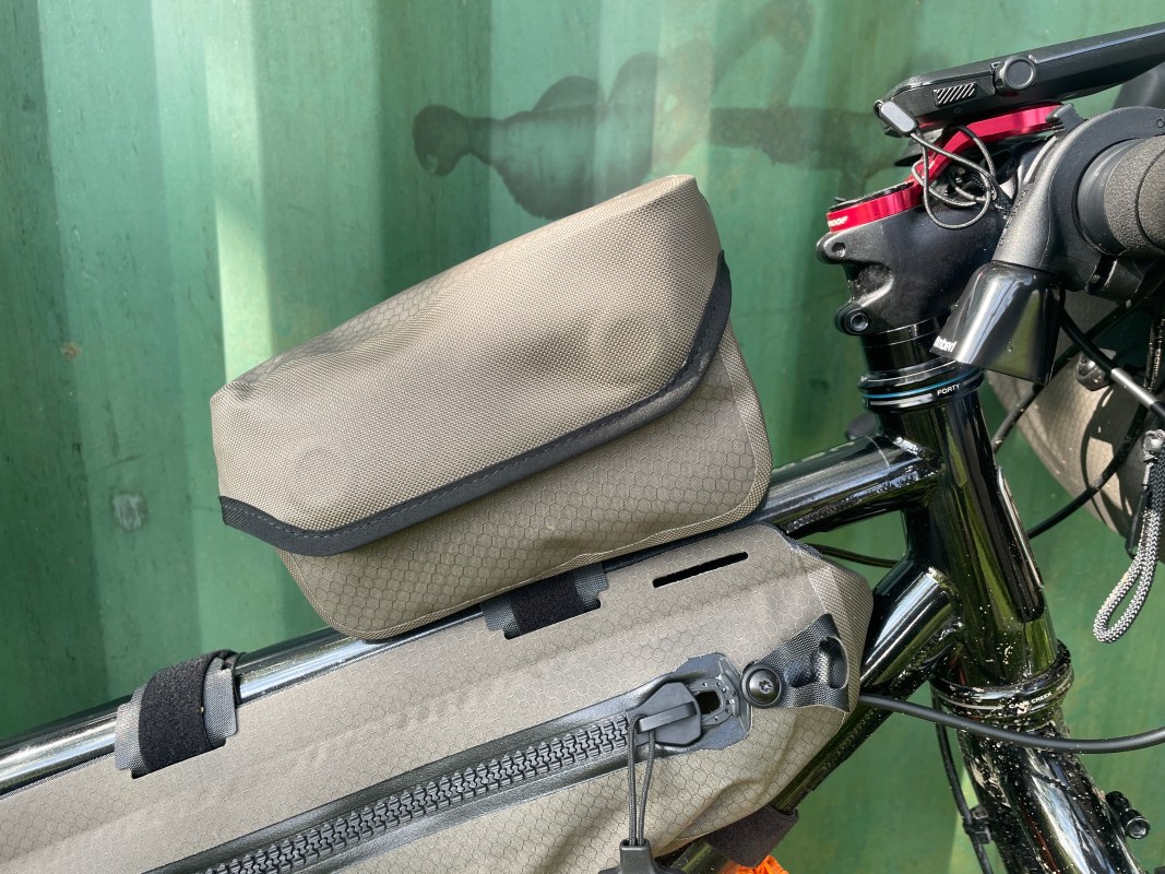 This sits on your top tube and attaches either to bolt-on mounts, or via a couple of straps. The lid is a sort of flap, which doesn’t completely hinge back. I suspect this helps keep it waterproof, although it does make access a little fiddlier as the lid wants to shut – which would be quite handy if you were grabbing food on the go. Fasteners on it are magnetic, which I liked a lot.