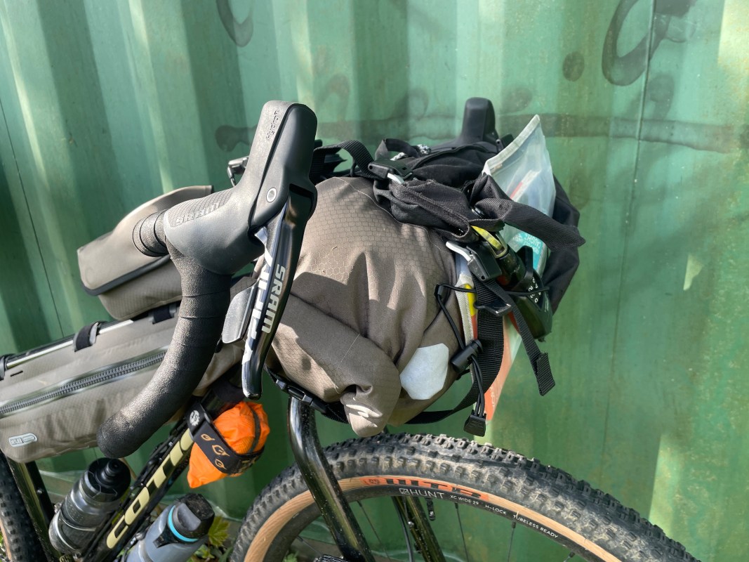 The name of the game here is stuffing. Stuff, stuff, squash, stuff. Fitting the bag to drop bars meant skipping a lot of the available space that this flexi pack offers – if you have flat bars you’d not have to worry about leaving thumb clearance around the hoods. Like the seat pack, it has a valve, making it easy to compress the contents and get any surplus air out. There is an access on either end of the pack, so in theory you could put a couple of easy access items on the ends and something you won’t need until night (like a sleeping bag) in the middle. I mounted it using the Handlebar Mounting Set QR, which uses para-cord to loop and fasten in place – easy enough to do and the pack clips on and off easily. Note that the Mounting Set QR isn’t compatible with carbon bars. Other mounts are available – compare and contrast them to suit your bars and light set up.