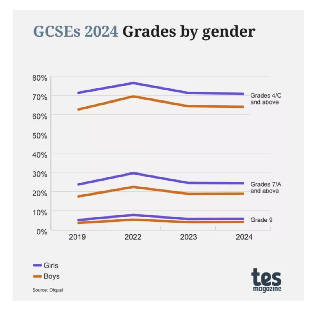 I never said that.The point is – comparisons can be inherently discriminatory if they are used with a view to encourage one group to do as another, but not the other way round.What are we encouraging boys to do, or aspire to? Significant enrichment could be had from female peers and role models.Anyway – girls achieve better GCSE results, which can lead to better opportunities in the long term. So whilst (according to you) they are being held back by simple sexism, let’s not worry about the boys’ results which have been significantly lower for quite some time. Figures below (from TES).Â