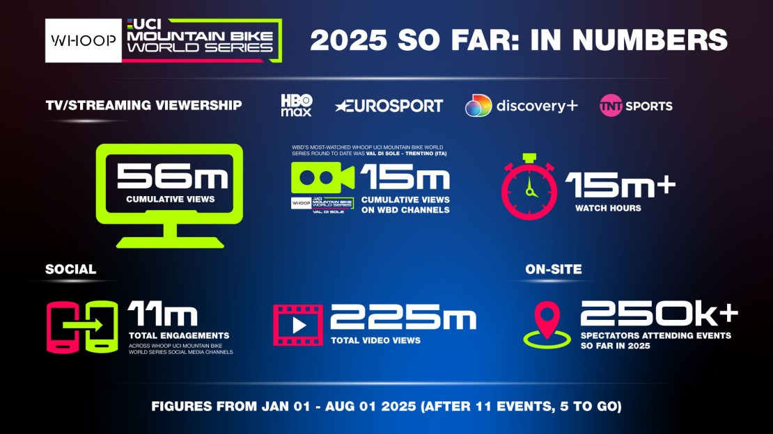 The 2025 WHOOP UCI Mountain Bike World Series has so far attracted 56 million cumulative views and 15 million watch hours across WBD channels, supported by strong digital, on-site, and content engagement.