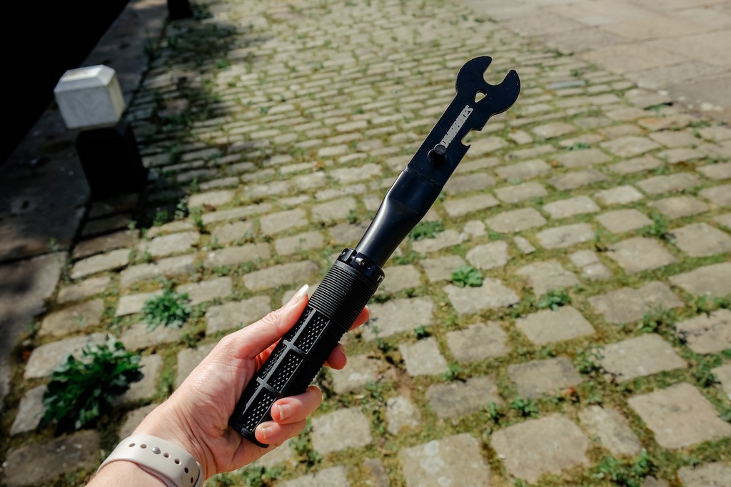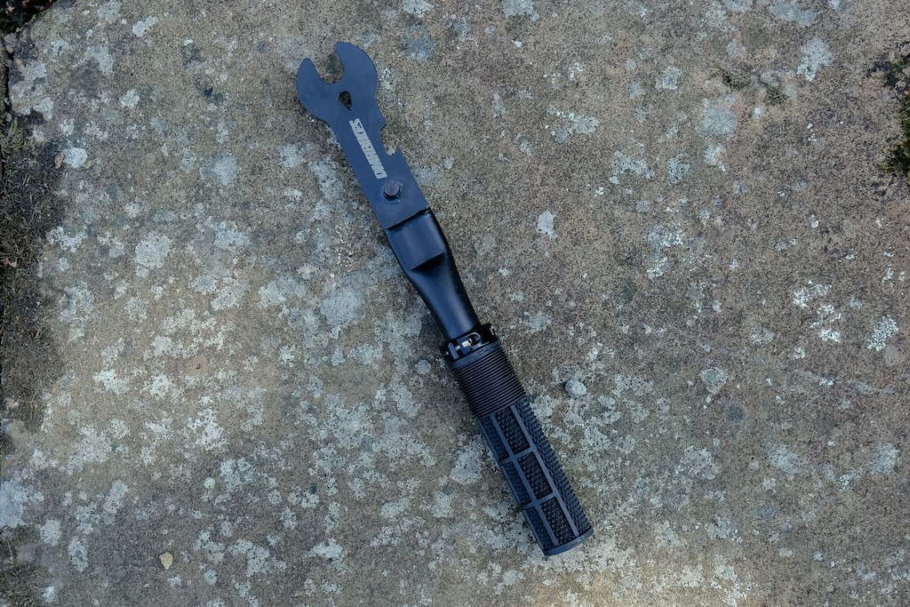 A rather OTT tool. And why not? Combining a decent amount of leverage and grippage (literally), there’s a 15mm spanner on the end, a 6mm Allen key on side, an 8mm Allen on the other side and a bottle opener for cracking open a delicious bottle of Appletiser once you’ve finally removed those seized-in pedals from your hack bike.