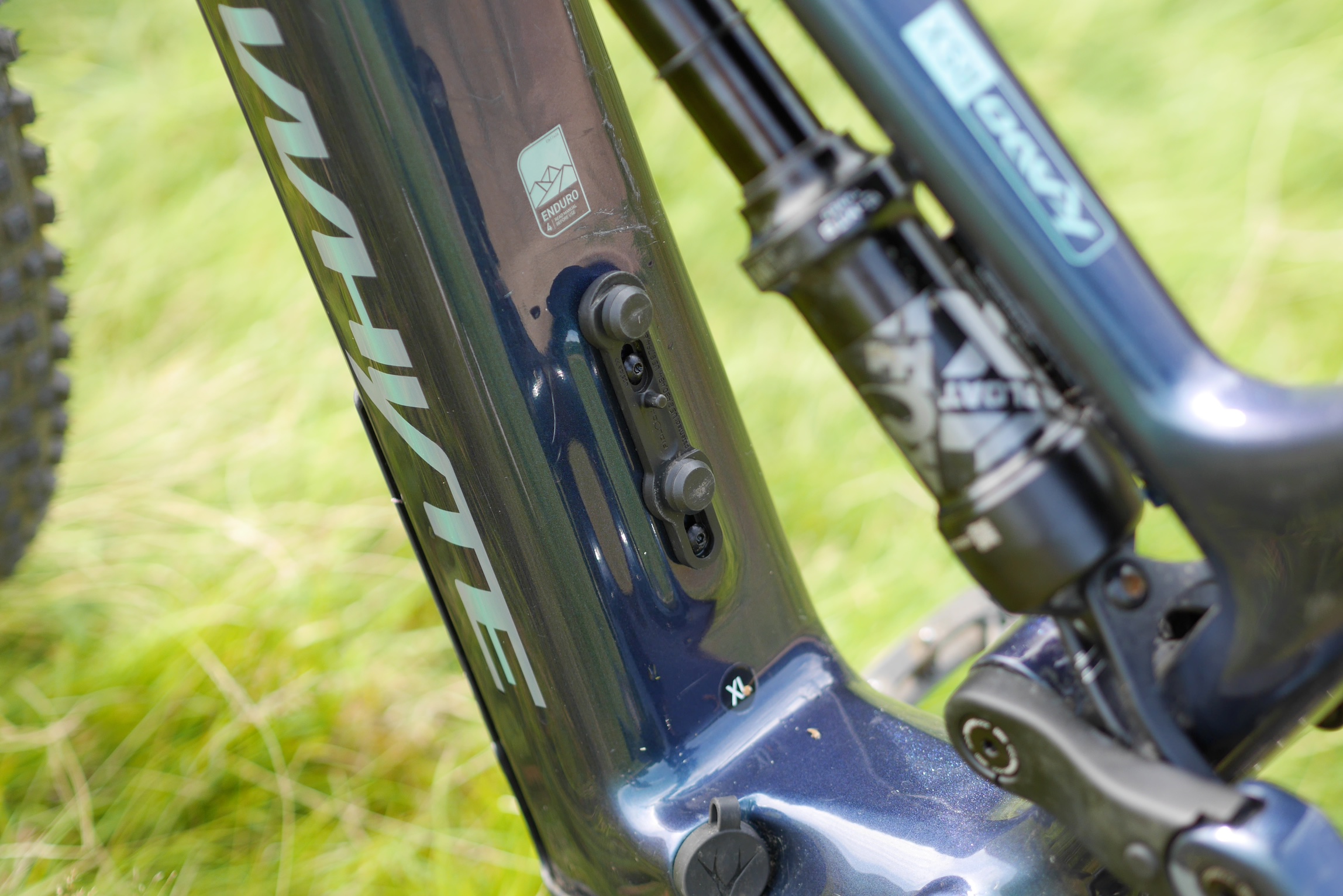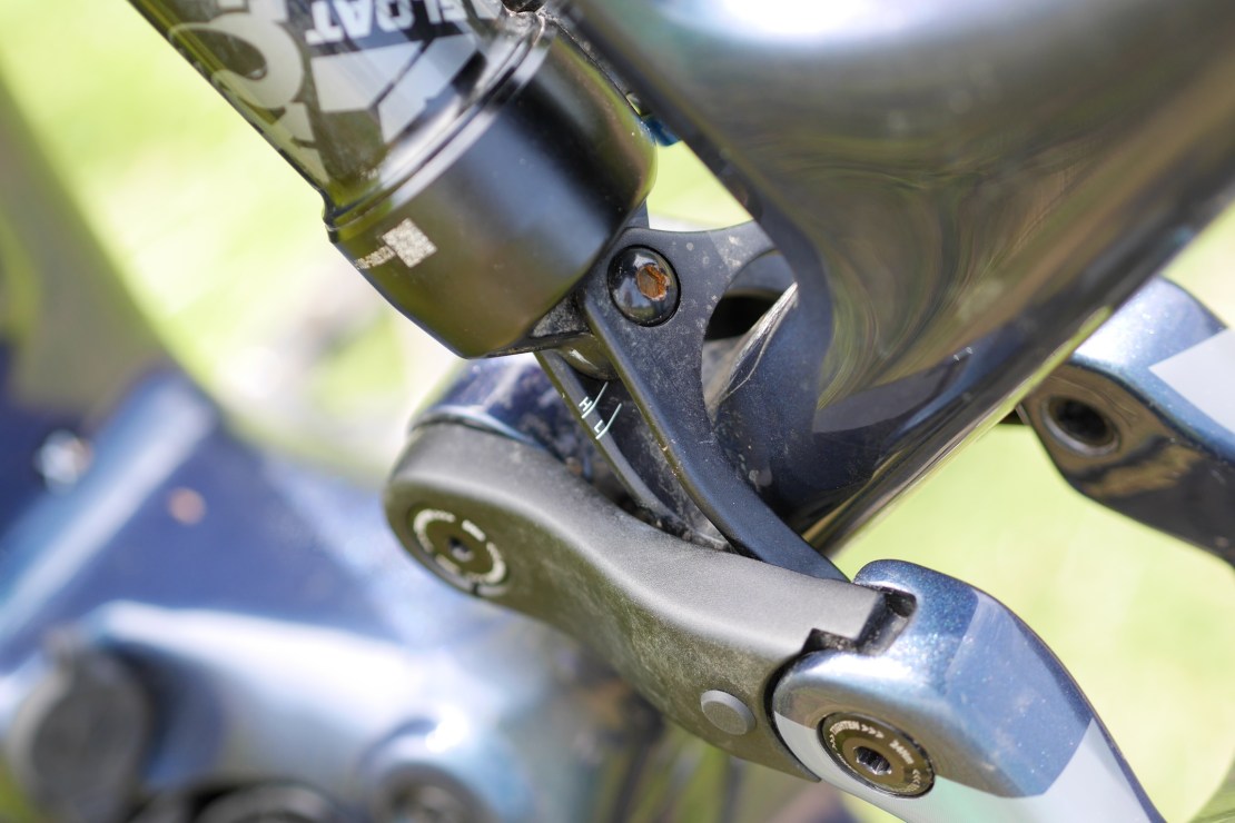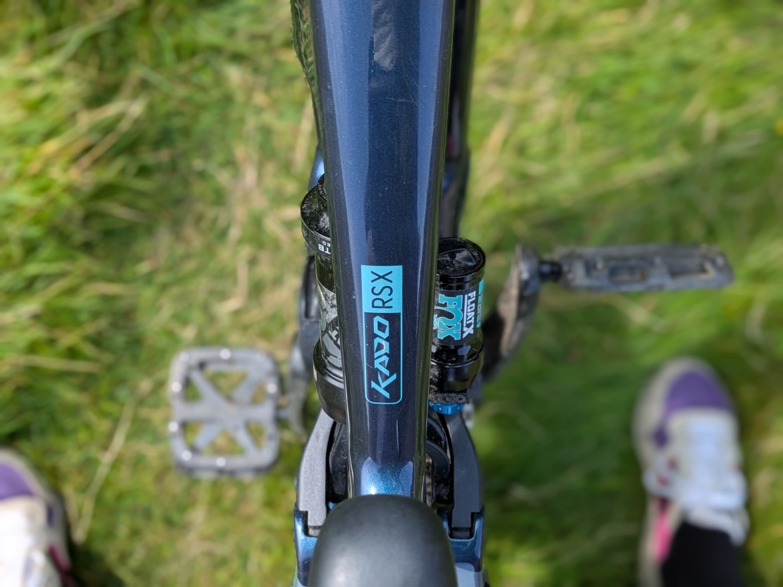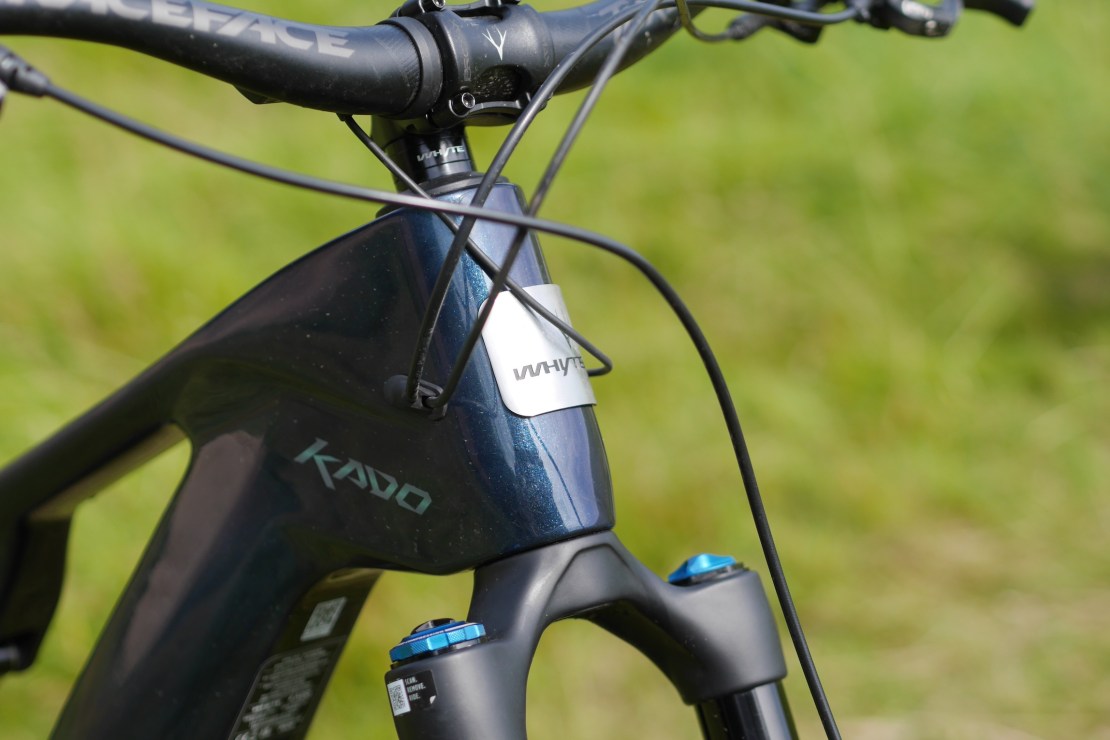 From the other week’s black Whyte hardtail to this week’s blue Whyte e-bike. The curiously named Whyte Kado (kar-doh? ka-doo?) is a full-power full-range trail eeb with 160mm travel fork up front and 150mm travel at the rear. Carbon frame. Latest firmware 5th Gen Bosch Performance Line CX with 100Nm of torque and 750 watts of peak power. Key geo numbers: 64.4° head angle, 77.5° seat angle, 450mm chainstays, 510mm reach (XL), 470mm seat tube (XL). Things of immediate note: the rotated rear shock, the flat mount caliper mount, 34.9mm KS Vantage dropper with novel under-the-saddle travel adjust (and markings) that is actually really good.