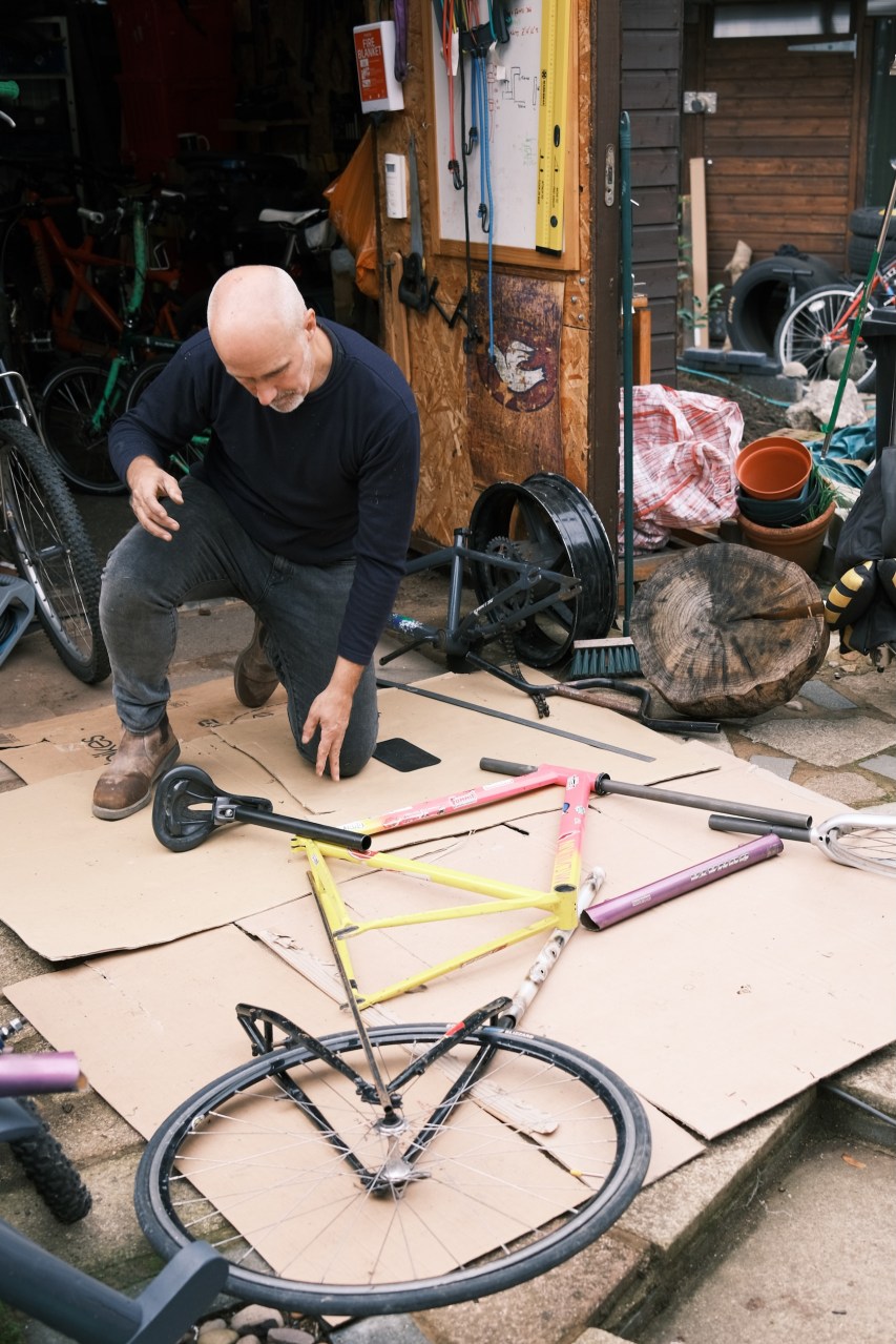 Most of this seemed to be happening in the US and Canada, so the obvious questions became ‘where were the tall bikes in the UK’, and ‘who was building them’? Alex and I couldn’t be the only ones who loved this kind of thing. That search eventually led us to Jon Thompson of Tomo bikes, who invited us into the fascinating world of bespoke bicycle fabrication via his overflowing and ever-expanding garden workshop – a treasure trove for any bike enthusiast. He then introduced us to Petor Georgallou, a former framebuilder who is known for creating all kinds of sculptural cycling oddities under the name Dear Susan, and who now runs Bespoked (the handmade bike show).