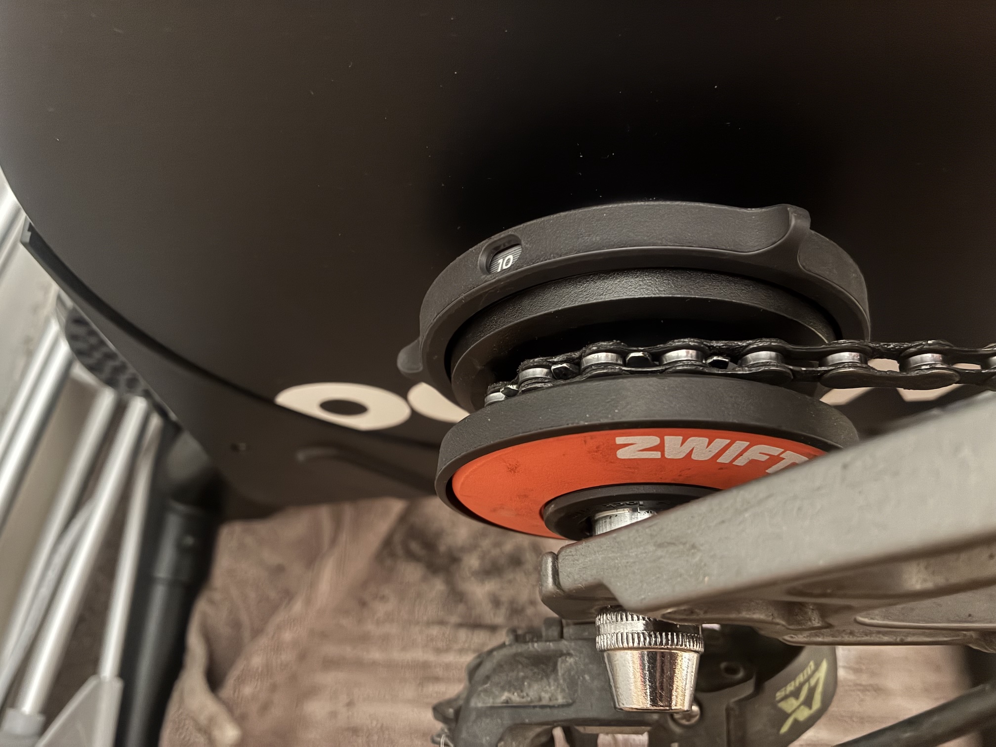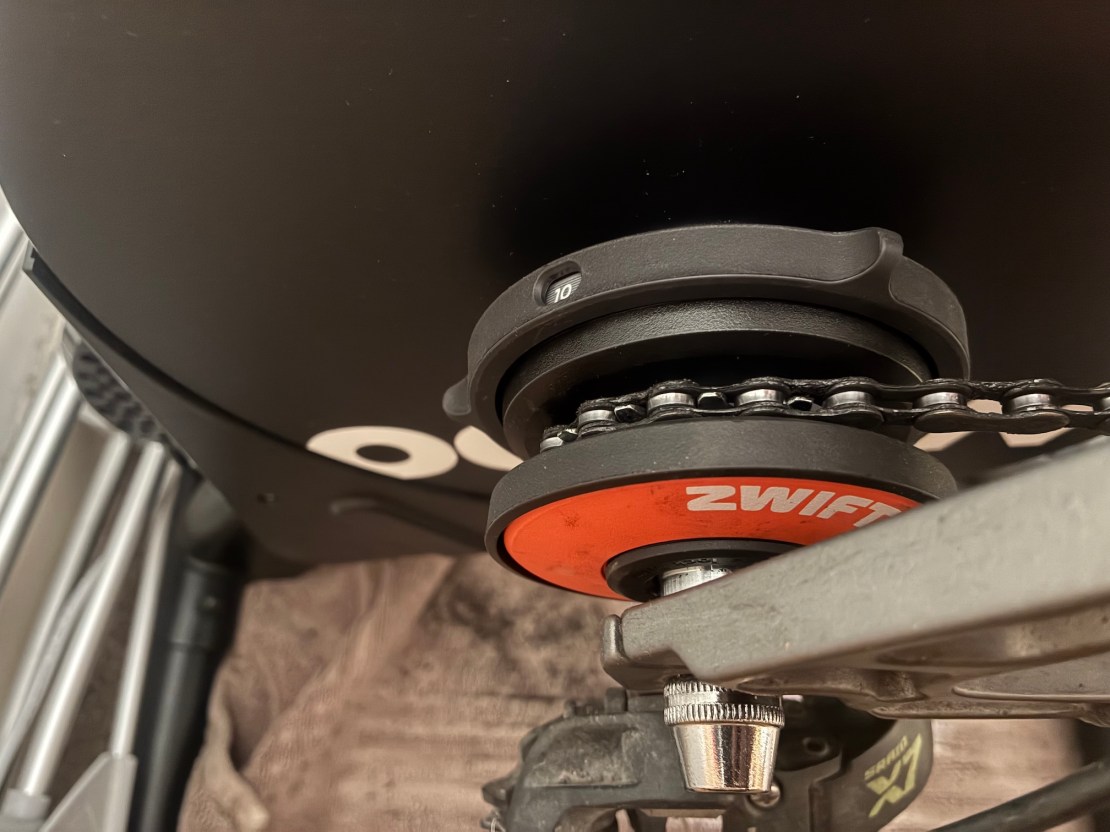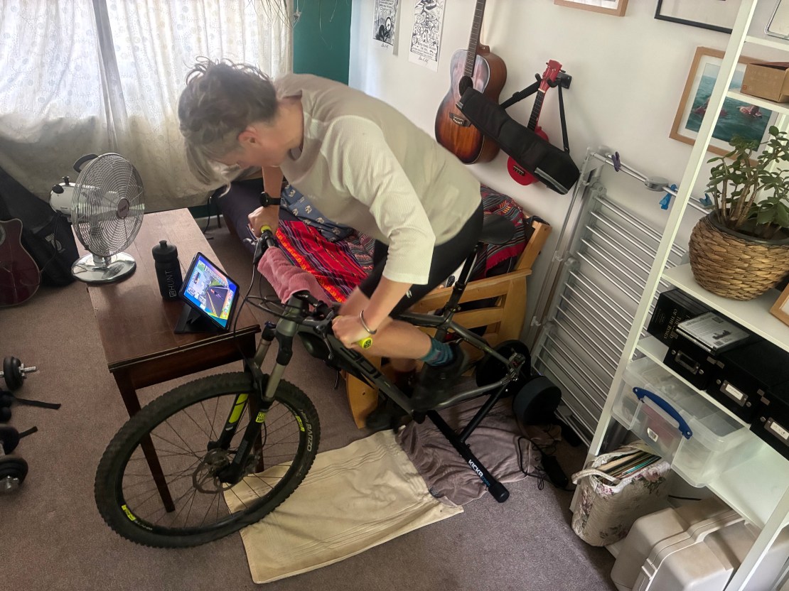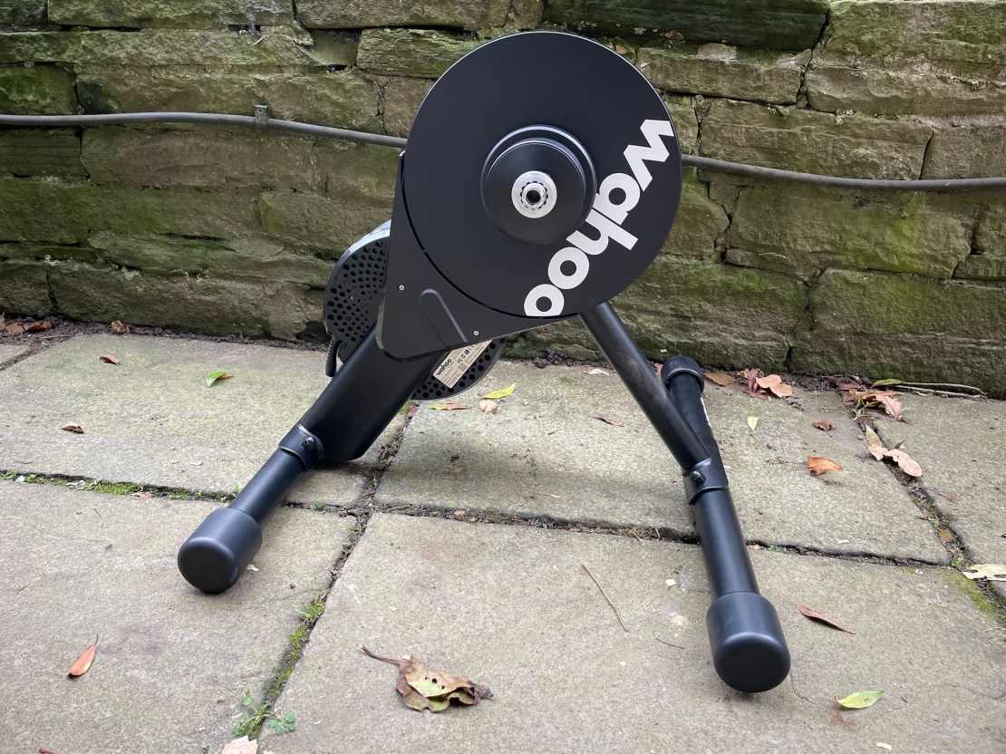 If you have an especially small front chainring, you won’t be able to reach the speeds needed for calibration. The 24T granny ring on my old hardtail was too small to be compatible. This two-ring drivetrain needed the updated Zwift Click version of the Zwift Cog. This gives a range of rear sprocket positions, enabling a straight chain line with the 38T big ring. If your gears are worn out, they’re not going to run smoothly on this, making for annoying training. And make sure your drivetrain is very, very clean before you start pedalling and spraying oily dirt onto your carpets. It’s not compatible with super boost rear ends, and for really putting the effort in you’ll want to make sure you can lock out your fork and shock. The simplest trainer I’ve had to use, but if I had the money I’d get the (£1200…) Zwift Ride Smart Frame to complete the perfect setup.