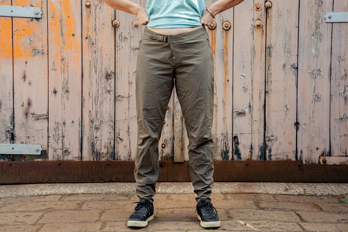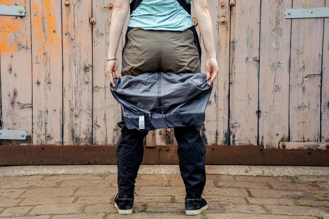The trousers are made of a very matt black nylon/spandex material that feels good to the touch and which has a DWR coating that beads water off it really well. The sizing is generous, in that the 32in size fits me, and I usually run to a 34in. And even then, I have the adjustable Velcro cinch tabs fully done up. Continuing the fit theme, there’s a bit of stretch built into the waistband, and the front closure has two poppers and a further Velcro square. There are belt loops for a very thin belt, if needed.