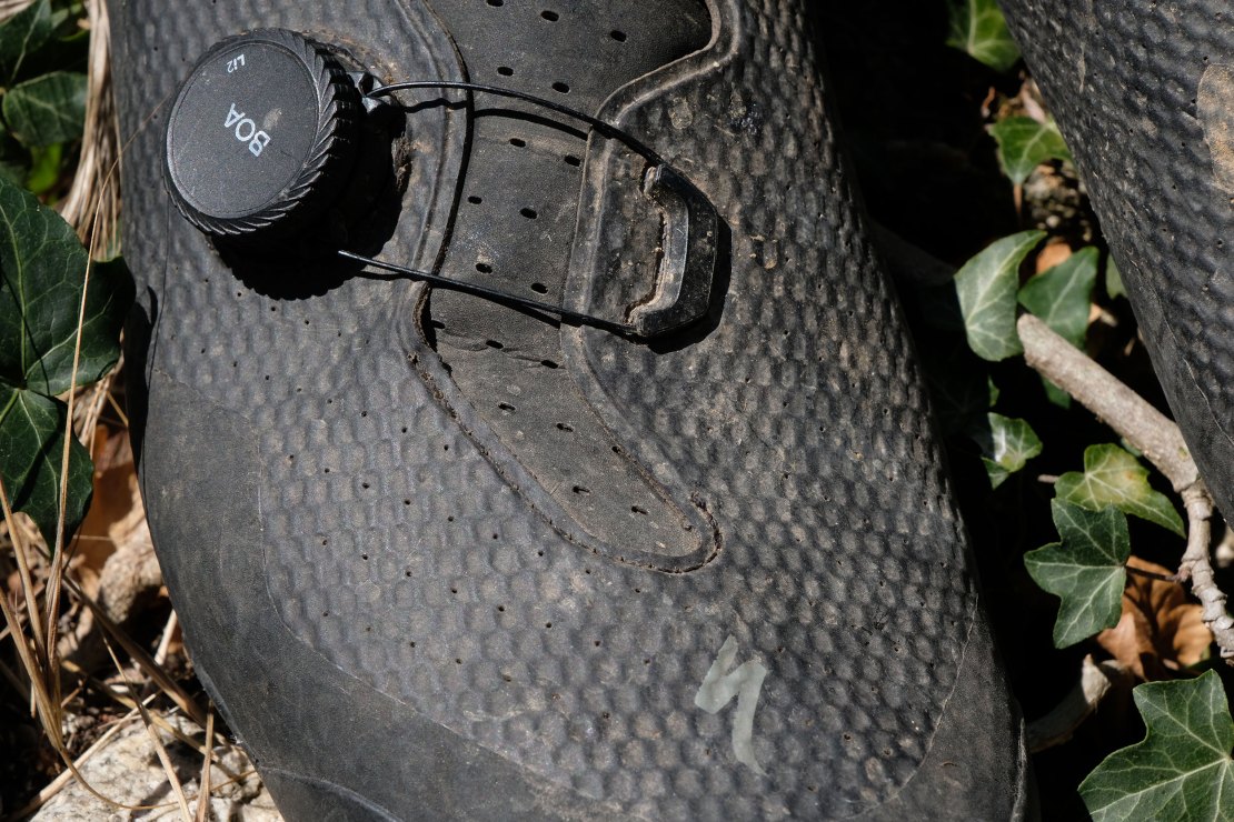 The sole itself has moulded studs, featuring Specialized’s beautifully named ‘Slip Not’ rubber, which has proved to be grippy on wet rock. There’s also a narrow grip strip on the insole for those cyclocross dismounts. There are no replaceable sole parts, but after nearly a year of thrice-weekly use, they’re showing little wear, despite the exposed carbon sole having taken a pounding.