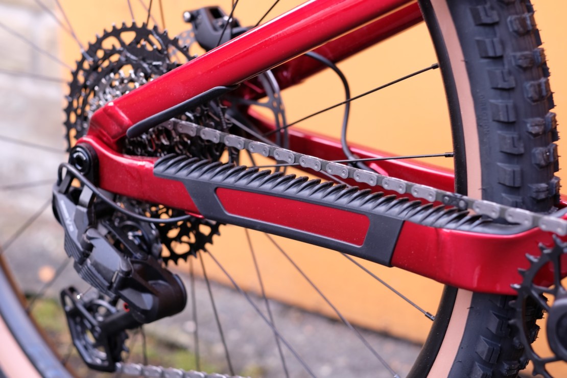 On the underside of the down tube is a pair of frame protection rubber pads. One for pick-up truck uplifting (or whatever) and one nearer the bottom bracket end of things. Both are welcome as protection from flying rocks. Also rubbery is the new chainstay protector.