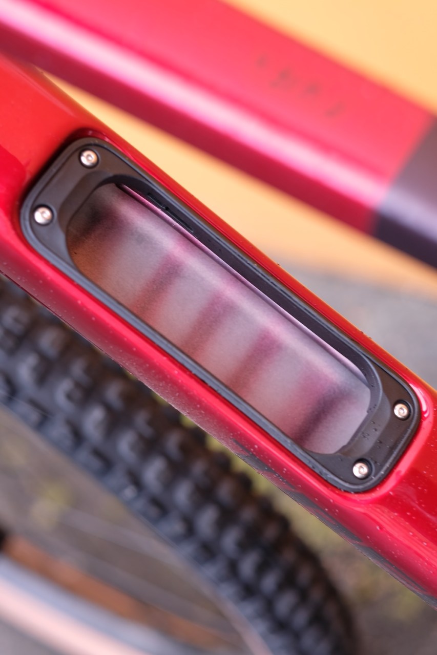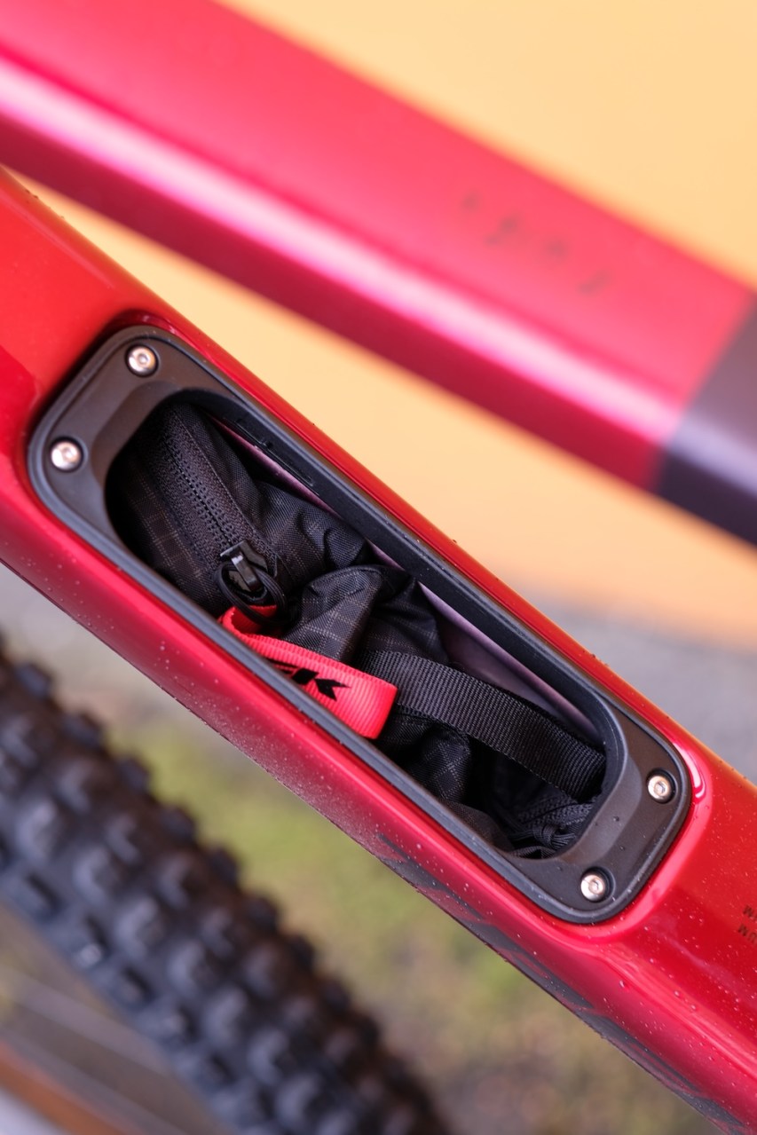 The down tube features a revised version of Trek’s internal frame storage. The opening is bigger. The seal is tighter. There’s two sausage bags in there. And the cables are better tucked away from interfering with inserting/removing the sausages. The storage lid is where you attach a water bottle, which can be a full-size bottle as front triangle room is more than ample.