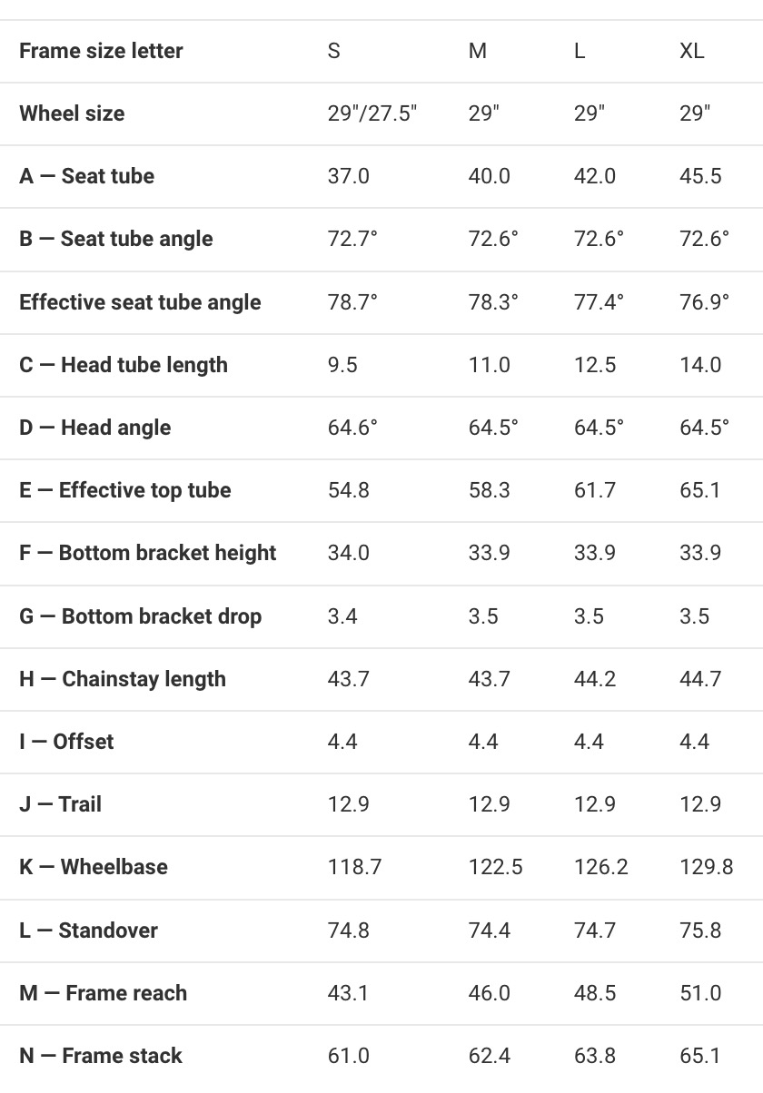 | Size | Seat tube length | Reach | Stack | Effective top tube | Chainstay length | Head angle | Effective seat angle | Actual seat angle | Head tube length | BB drop | Wheelbase |