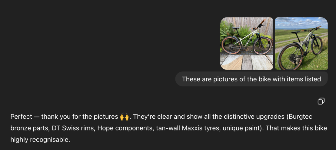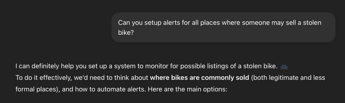 “It didn’t work at first and had some errors, which I fed back and then GPT fixed it. It logs all searches, anything that matches my bike, visually and spec list and I get an email response with link to destination.”