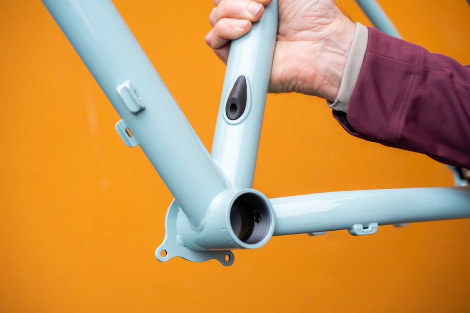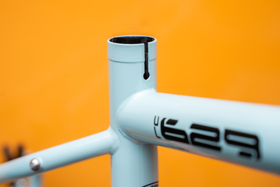 (*especially if you run a shimmed 30.9mm post in the 31.6mm seat tube for a teensy bit more leeway; this Large frame swallows a 200mm RockShox Reverb AXS with ease btw)