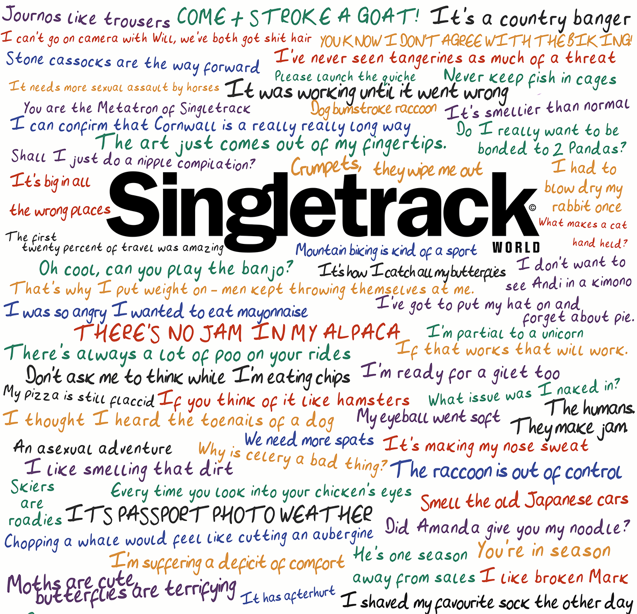 Spinelines. Those out of context statements on the spine of every mag. A selection of sometimes dumb, sometimes inappropriate, but always hilarious comments made in Singletrack Towers. Nowadays we keep them in a Google Doc, but the original whiteboard still takes pride of place in the office and we wanted to honour that before someone accidentally wipes it off.