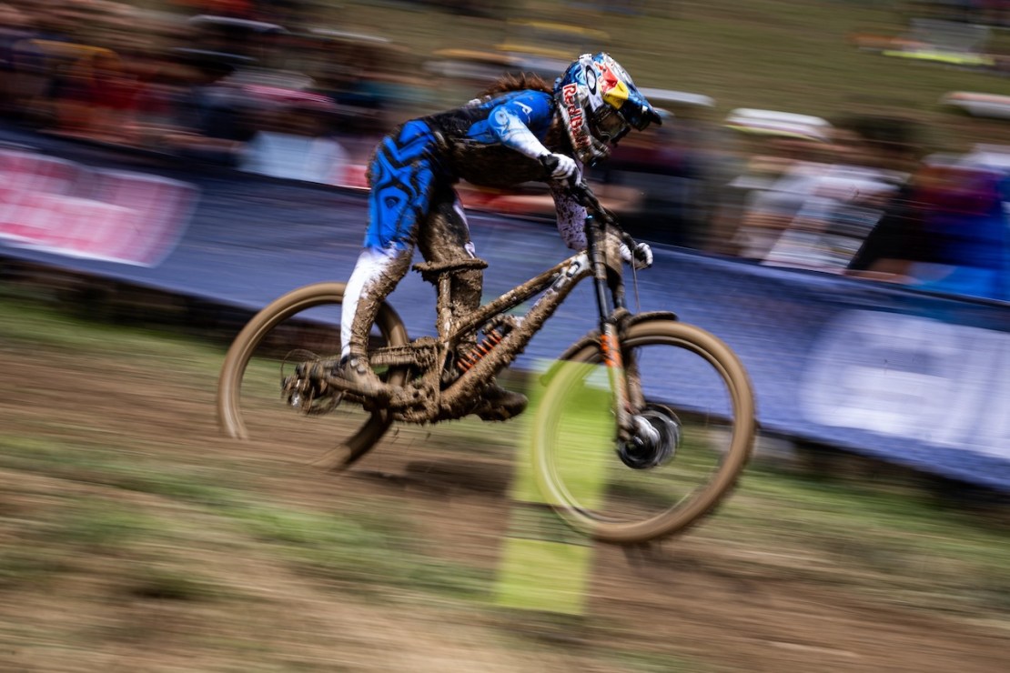 Loris Revelli the first down the ramp and attacked the course aggressively, taking both feet off the pedals to steady himself at one stage, but it was Troy Brosnan (Canyon CLLCTV Factory Team) who set the first real benchmark, celebrating a century of UCI Downhill World Cup appearances.
