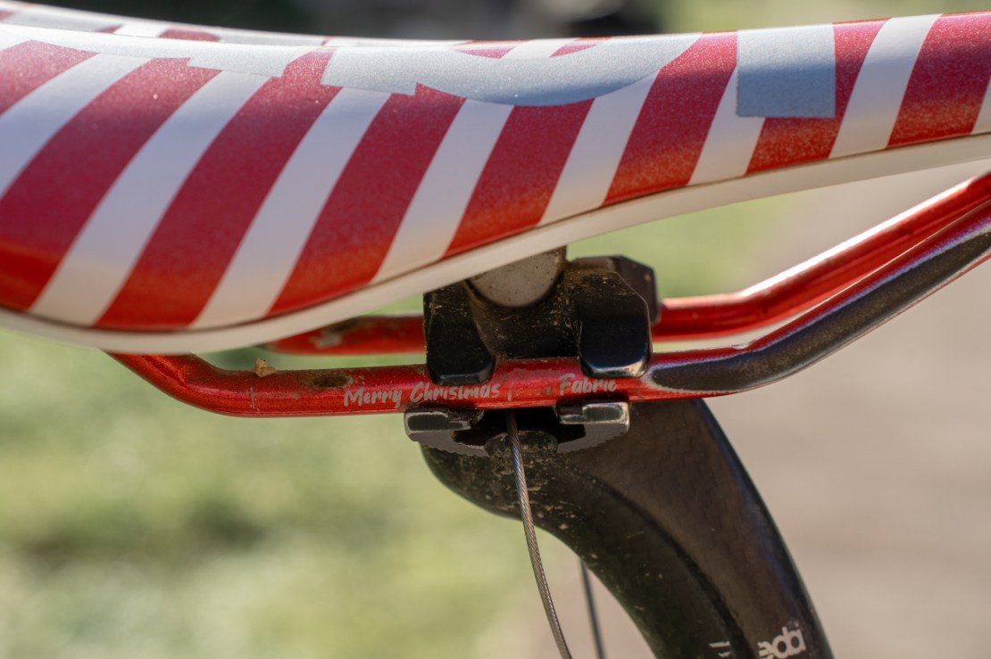 And the final piece in the Peaks puzzle is probably the one that gets the most double-takes. mounted to the snazzy ‘Merry Christmas from Fabric Cycles’ saddle is an old gear cable, joined in a loop with a junction box and passing through a gap in the seatpost QR collar. This marks my full saddle height, so that I can drop the saddle for the worst of the descents and then raise it again, knowing that it’ll be exactly the right height. This can usually be done while pushing the bike and probably only adds 5g to the bike’s weight – way simpler and lighter than adding a dropper post, given that it only gets used about twice in the event.