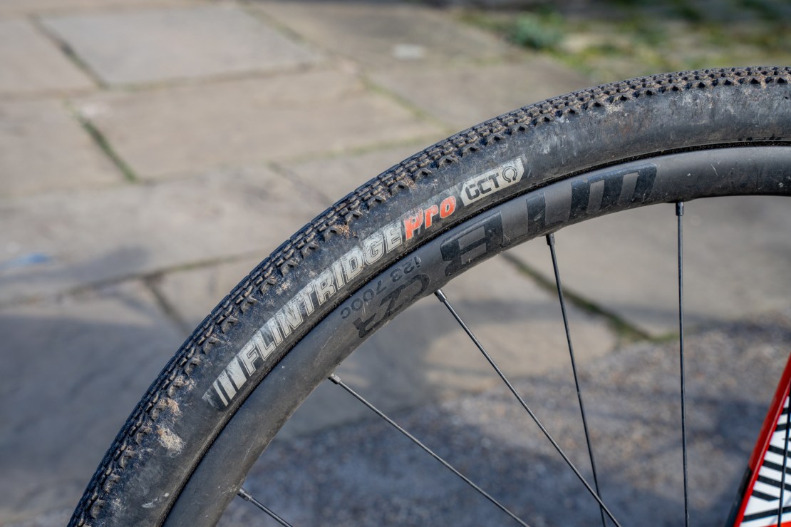 When we get to the wheels and tyres, there’s some more Peaks-specific touches. The wheels are WTB’s carbon CZR range with i23 rims. In the rear, I have a CushCore rim strip and the tyres are, of course, tubeless. A far cry from the inner tube days of running 90-odd PSI… The tyres themselves are Kenda Flintridge in 35mm size. I say 35mm, as that’s what they’re marked as on the sidewall. However, they run large and are probably more like 38mm on the rim. This is compliant with the letter (and probably even spirit) of the official rules and they just give a tiny bit more comfort on the massively rocky descents of Whernside and Pen y Gent.