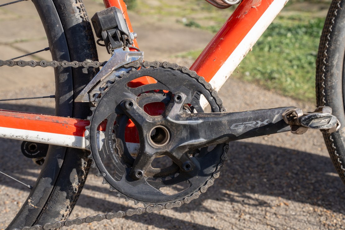 For the double chainring, I actually downgraded to the lower 600-series cranks, as they have a lower 31T bottom gear, getting me just under a 1:1 gear ratio in bottom gear – essential for Pen y Gent lane, when you can actually ride a bike if the gearing is low enough. It’s not a 10-51T, but it’s as low as this bike can go at the moment. Even so, the front mech is jammed as low as it’ll get on the frame boss, still leaving a load of fresh air between cage and chainrings… Obviously the bike was designed by those Milton Keynes-based Madison flatlanders.