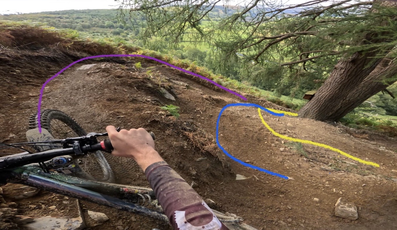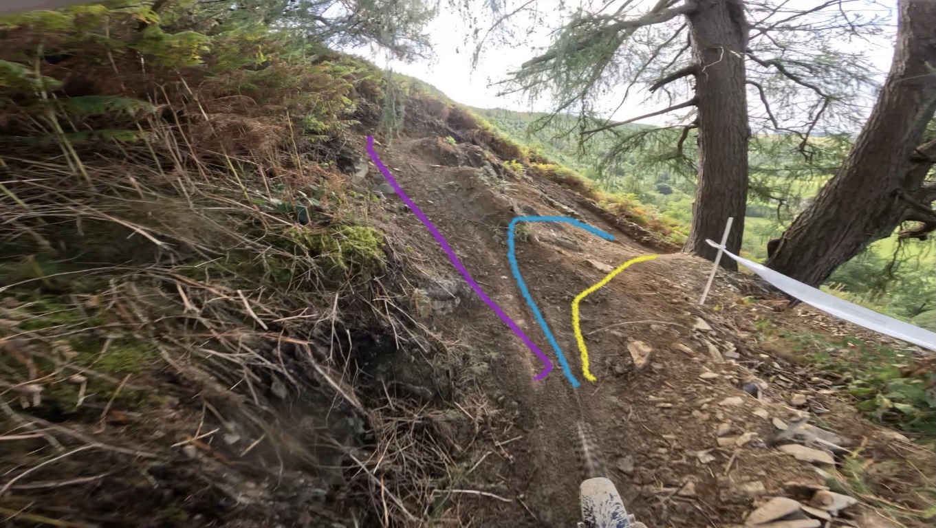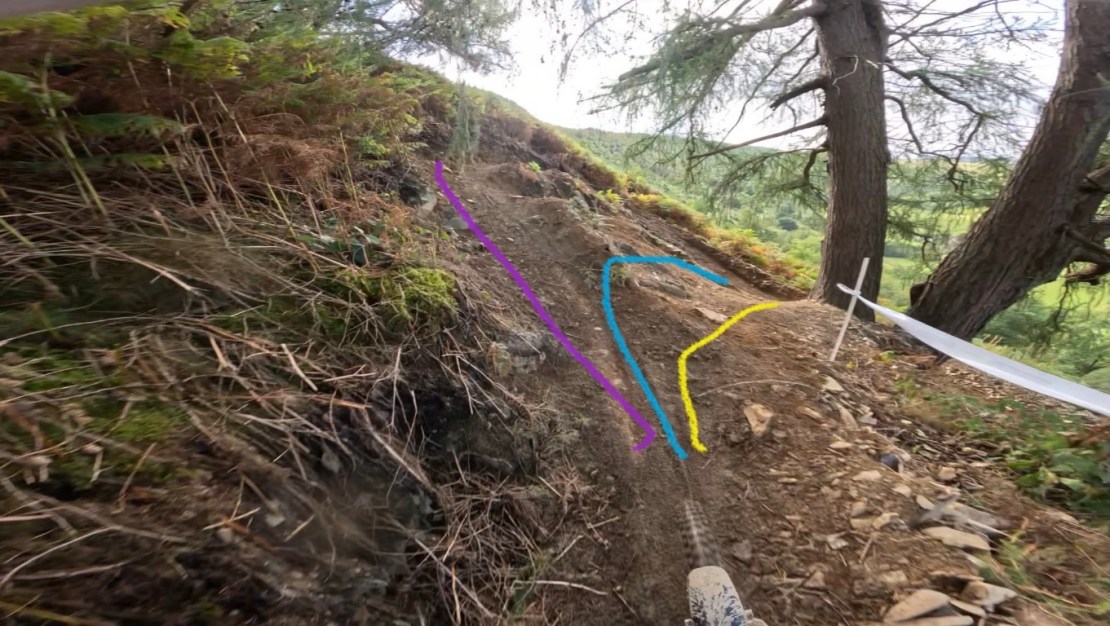 This section on Stage 2. I didn’t really come to the conclusion of which line was quickest (you decide). This section had three options with a fairly predictable outside line (purple) but two much tighter inside lines (yellow and blue) with some nasty jackknife turns to return you to the main line. The outside here is heaps longer and, whilst it has support, it’s not enough for most to comfortably fly round at speed. What adds some further puzzle to this is that straight after this corner there is a gap which straightens out the track and will save some serious time. It’s comfortably doable from the outside but much more difficult to clear from the shorter, more direct inside.