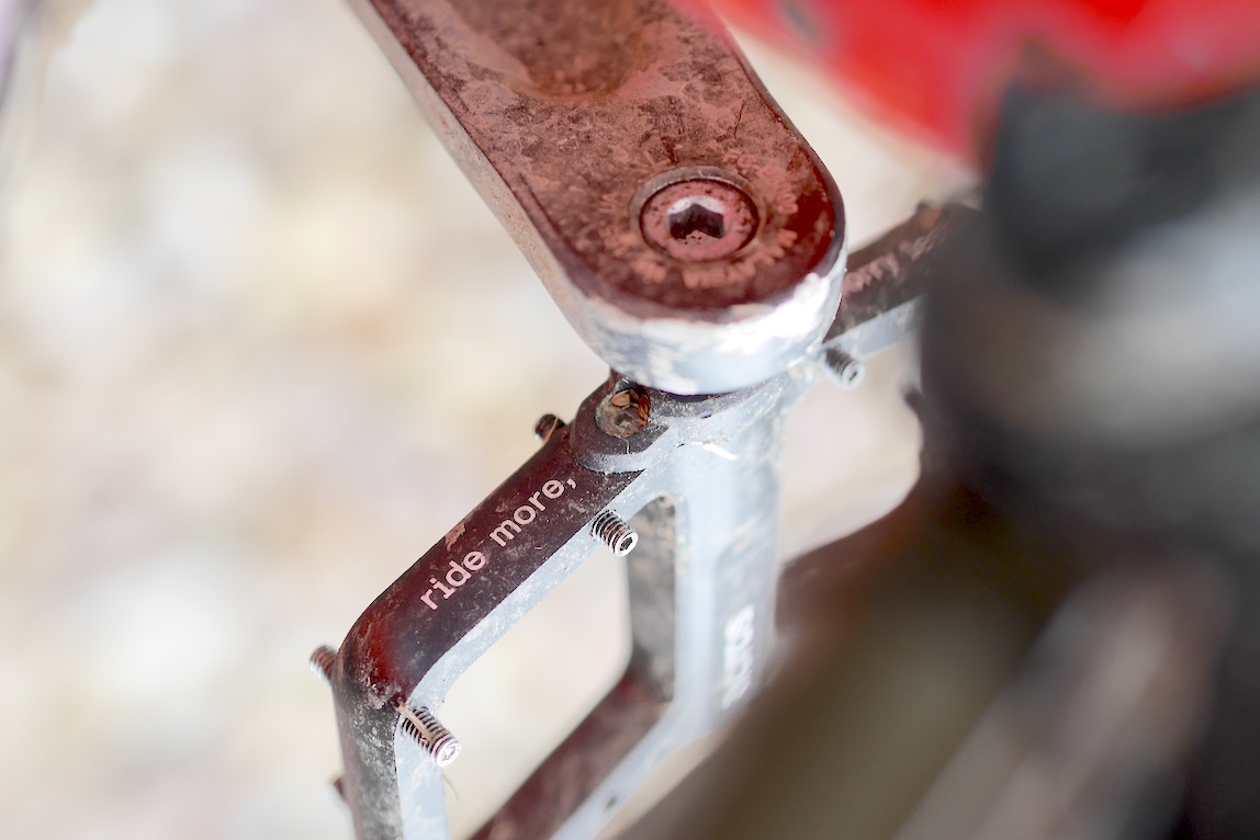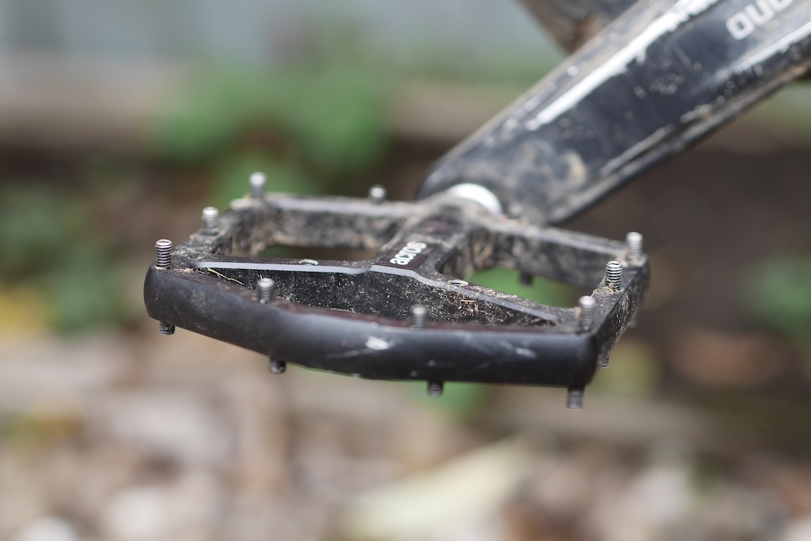 We forgot to get pics of these when they were box fresh. And before I removed the central pins too. Soz. In a market of seemingly countless flat pedals it’s hard to stand out. The overall vibe of these flatties from Acros is compactness without too much compromise. They’re pretty un-wide (108.6mm) but are quite long fore-aft (144.5mm). And at 12mm thick they’re pretty thin without being totally ‘waffer theen’ to the point where bearings and concavity become iffy. I’ve installed them on a 29er ebike that I’ve guerilla-bodged into a mullet – so I need all the pedal strike avoidance assistance I can get!