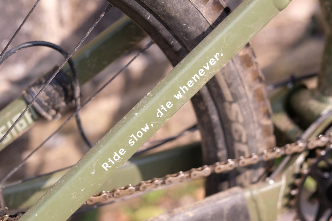 One thing I’d be looking for, if that was my bike with the Stridsland “Ride Slow.." sticker, would be some tape the right shade of green to cover over the T of Sight, just to encourage or excuse lingering at scenic stops.