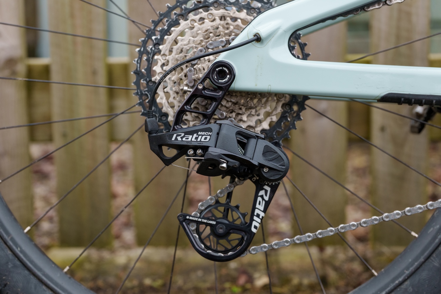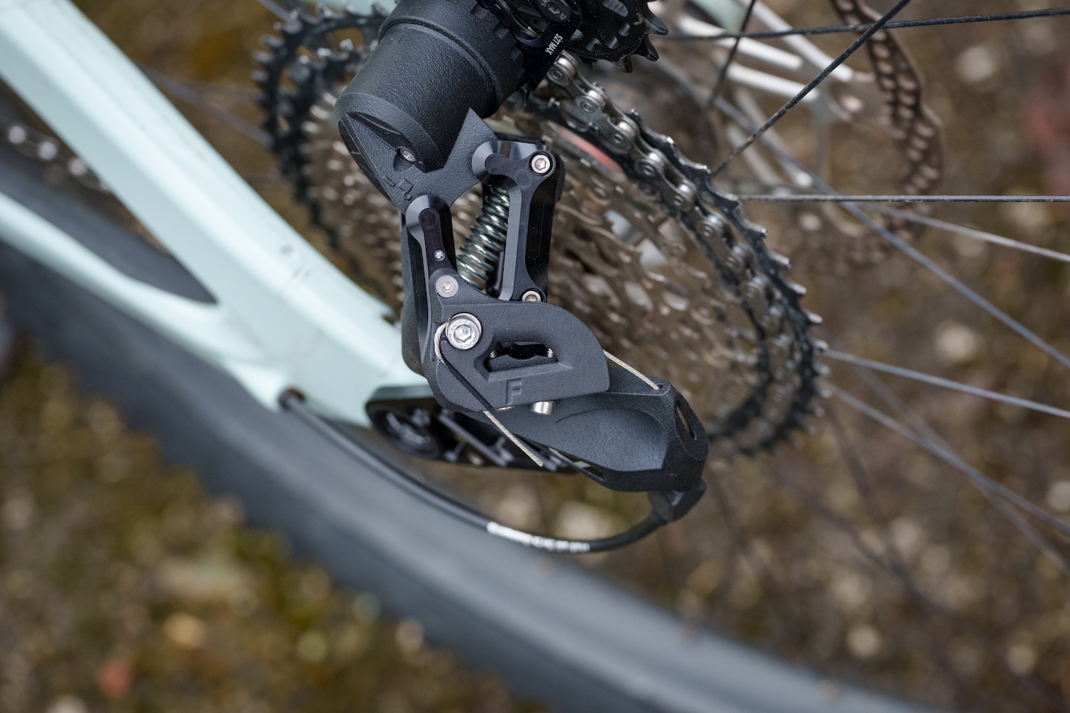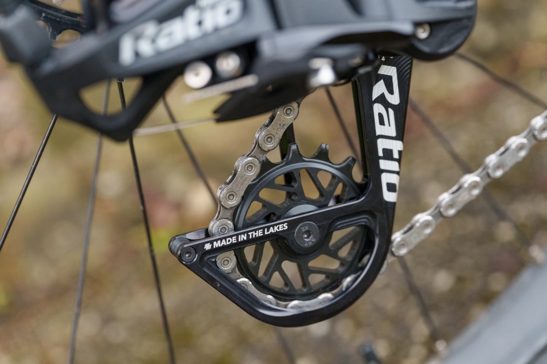 A new rear mech, entirely made in the UK. The main parts are machined by Ratio in the Lake District. The MJF nylon parts are made down in Suffolk. The mech is entirely rebuildable using a multitool and will be available for both direct mount/UDH or regular mech hangers. So if youโve got a UDH bike, you can mount it direct, if not then itโs three screws to undo and you can get the replacement parts from the website. Itโs got a wrap spring clutch which has a very low backlash. Stainless steel bearings and pivots which makes for easier shifting and wear well.