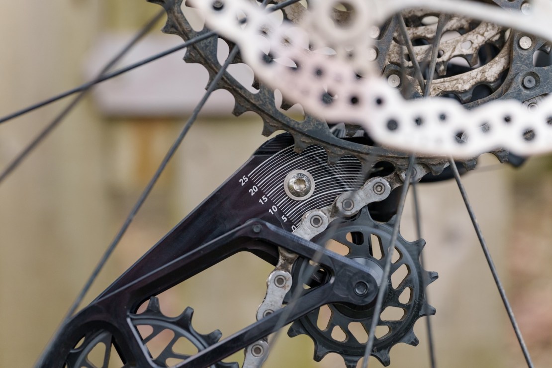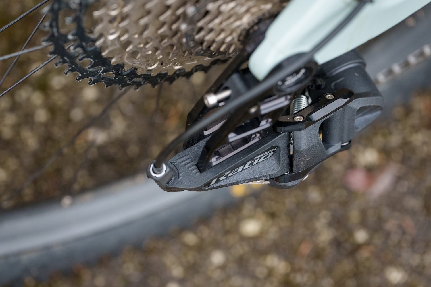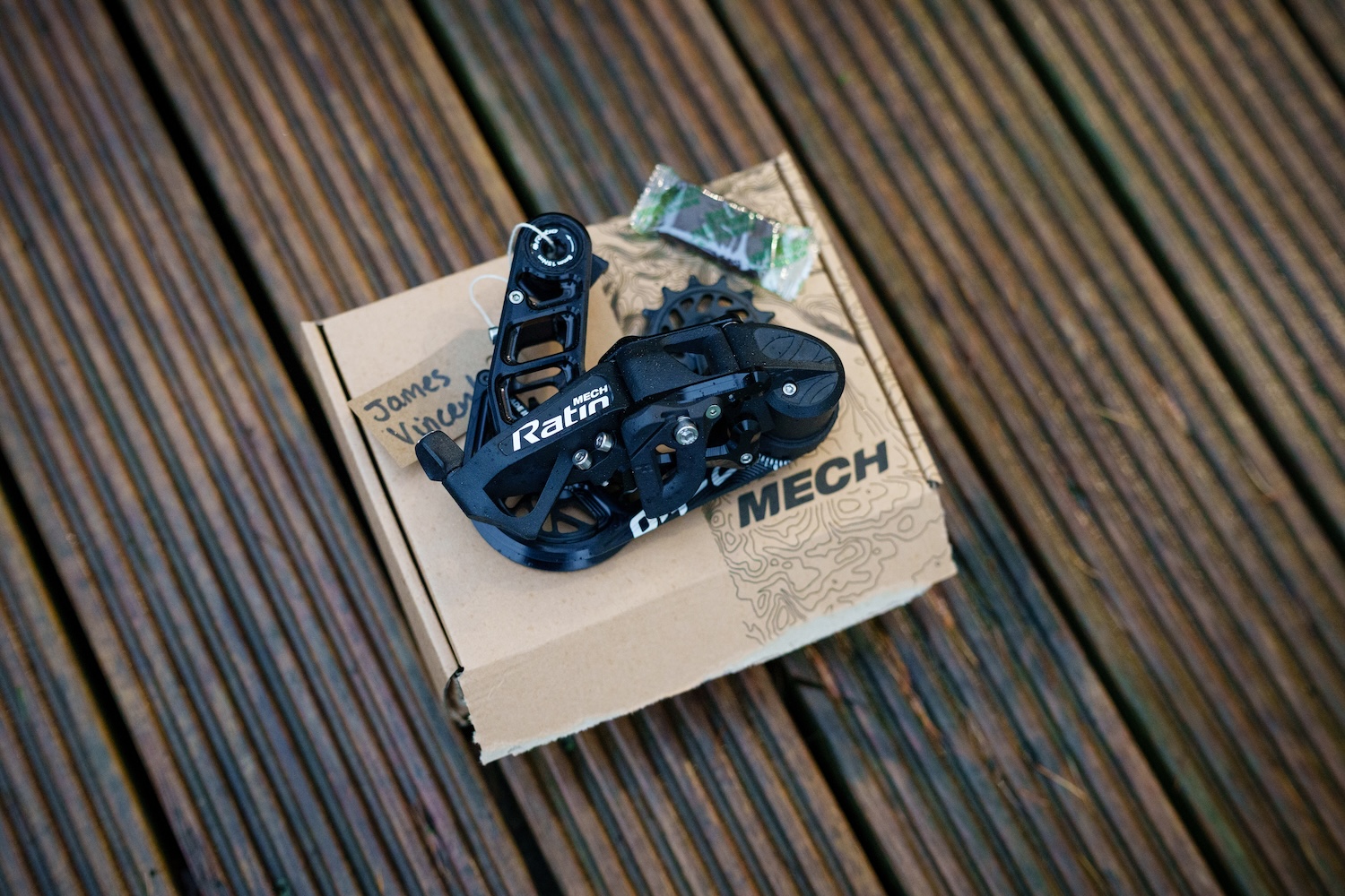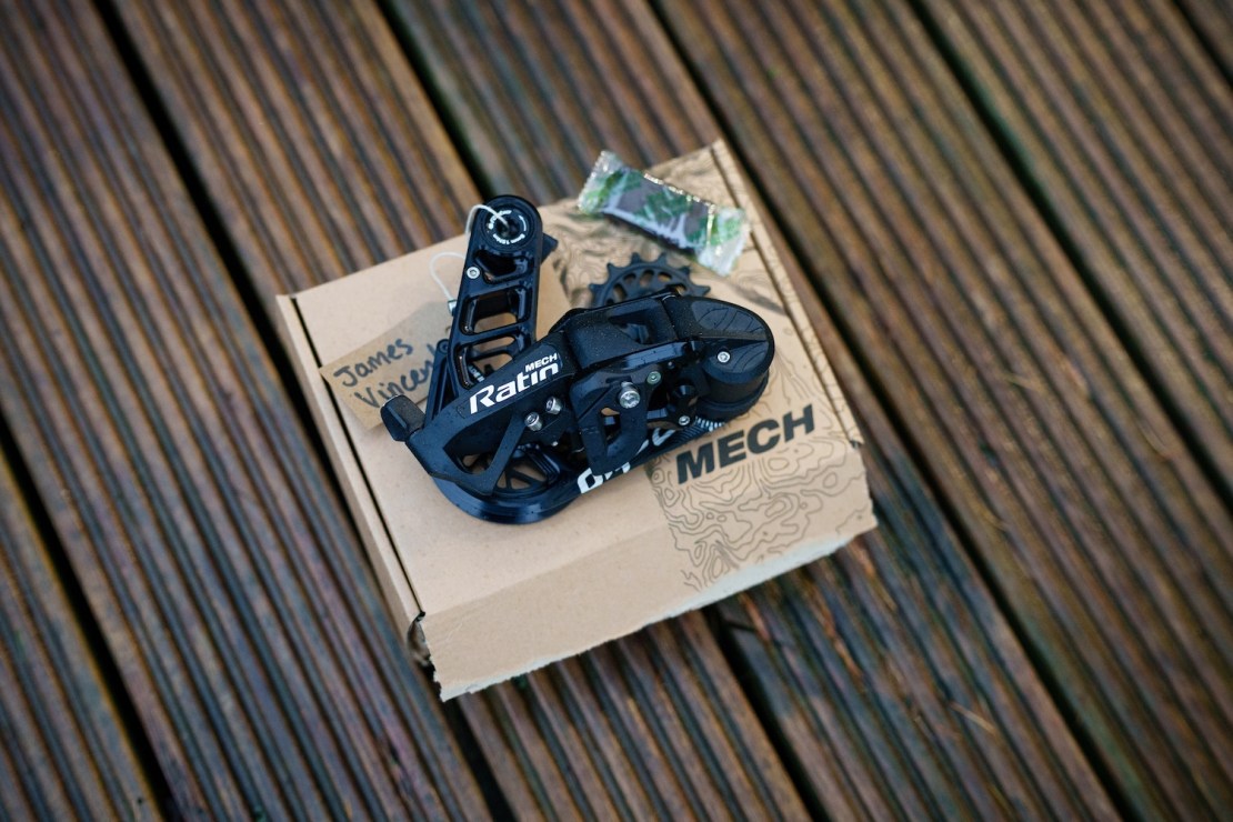 A new rear mech, entirely made in the UK. The main parts are machined by Ratio in the Lake District. The MJF nylon parts are made down in Suffolk. The mech is entirely rebuildable using a multitool and will be available for both direct mount/UDH or regular mech hangers. So if youโve got a UDH bike, you can mount it direct, if not then itโs three screws to undo and you can get the replacement parts from the website. Itโs got a wrap spring clutch which has a very low backlash. Stainless steel bearings and pivots which makes for easier shifting and wear well.