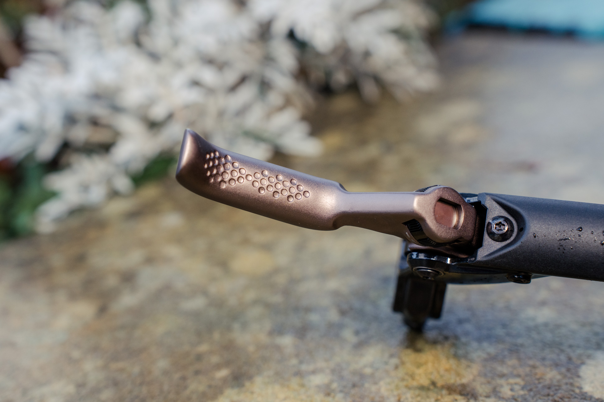 We’ve been consistently impressed by the four-pot Hayes Dominion A4 brakes (there’s a strong case that they are the best all-round brake out there) so we wondered about the little sibling version: two-pot the Dominion A2. Aimed at XC and regular trail rider types. The lever is designed to have the “shortest dead stroke possible and a crisp bite point”. Tร24mm pistons. Cold-forged caliper. KingPin “structural” pad retention bolt that intends to increase stiffness. Dual port bleed system. Tool-free reach adjustment.