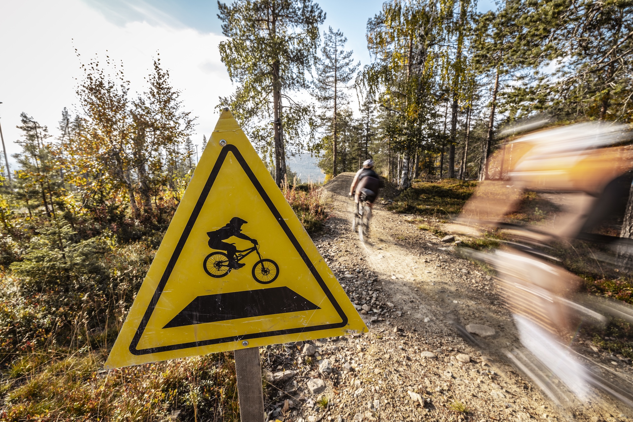 Our first loop starts in Yllรคs. Just a few kilometres in, itโs clear that the trails weโre riding, which are used by hikers and mountain bikers in the warmer months, double as cross-country ski tracks in the winter. We climb steadily on wide rugged paths up to the highest point of the fell. From just under 400m above sea level, we have a perfect view of the area. The nearest ski resort rises a few hundred metres higher, standing out against the flat landscape. Forests stretch as far as the eye can see, with only occasional signs of civilisation in the form of log cabins or small villages. We switch from wide gravel paths to narrow singletrack winding through the forest.