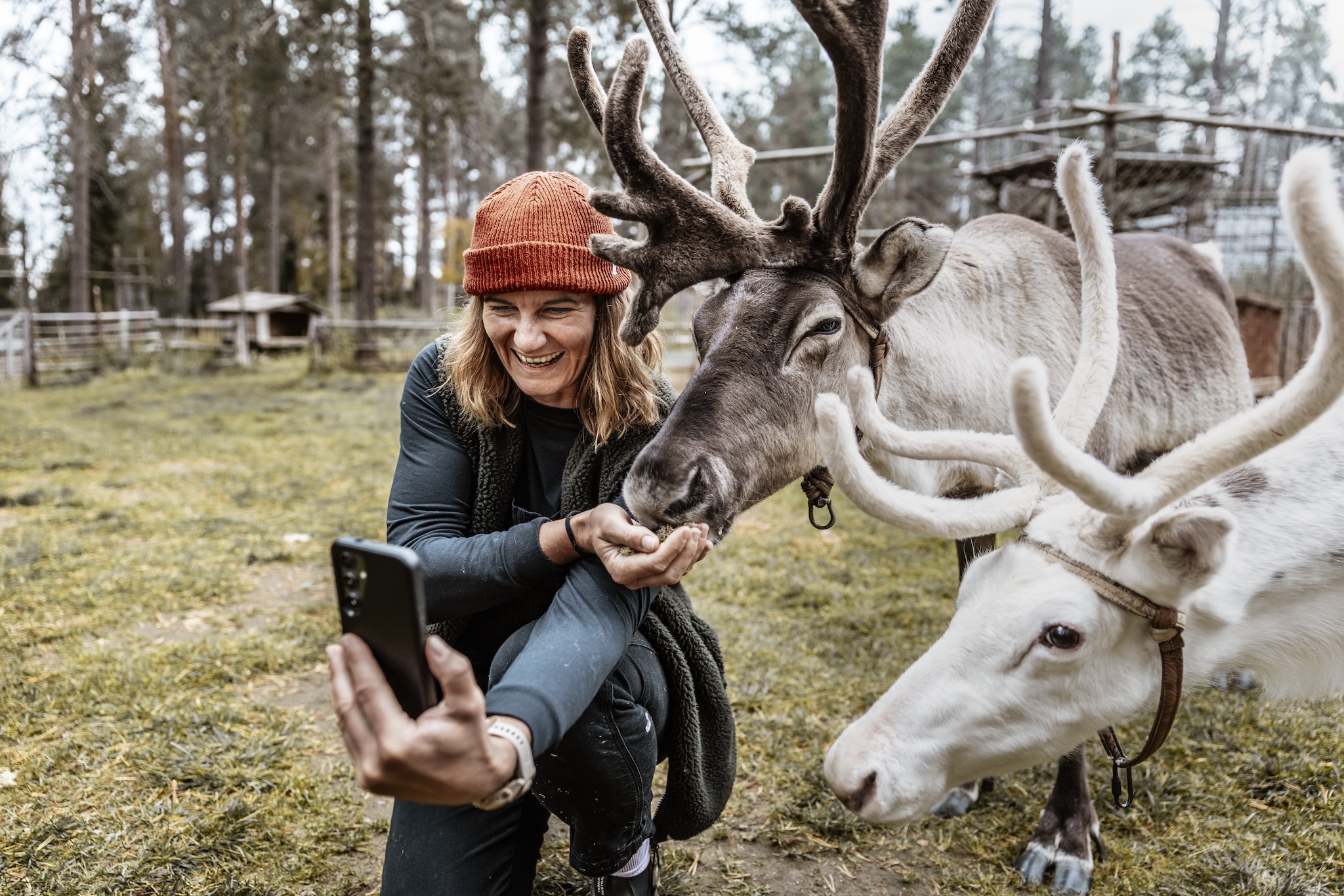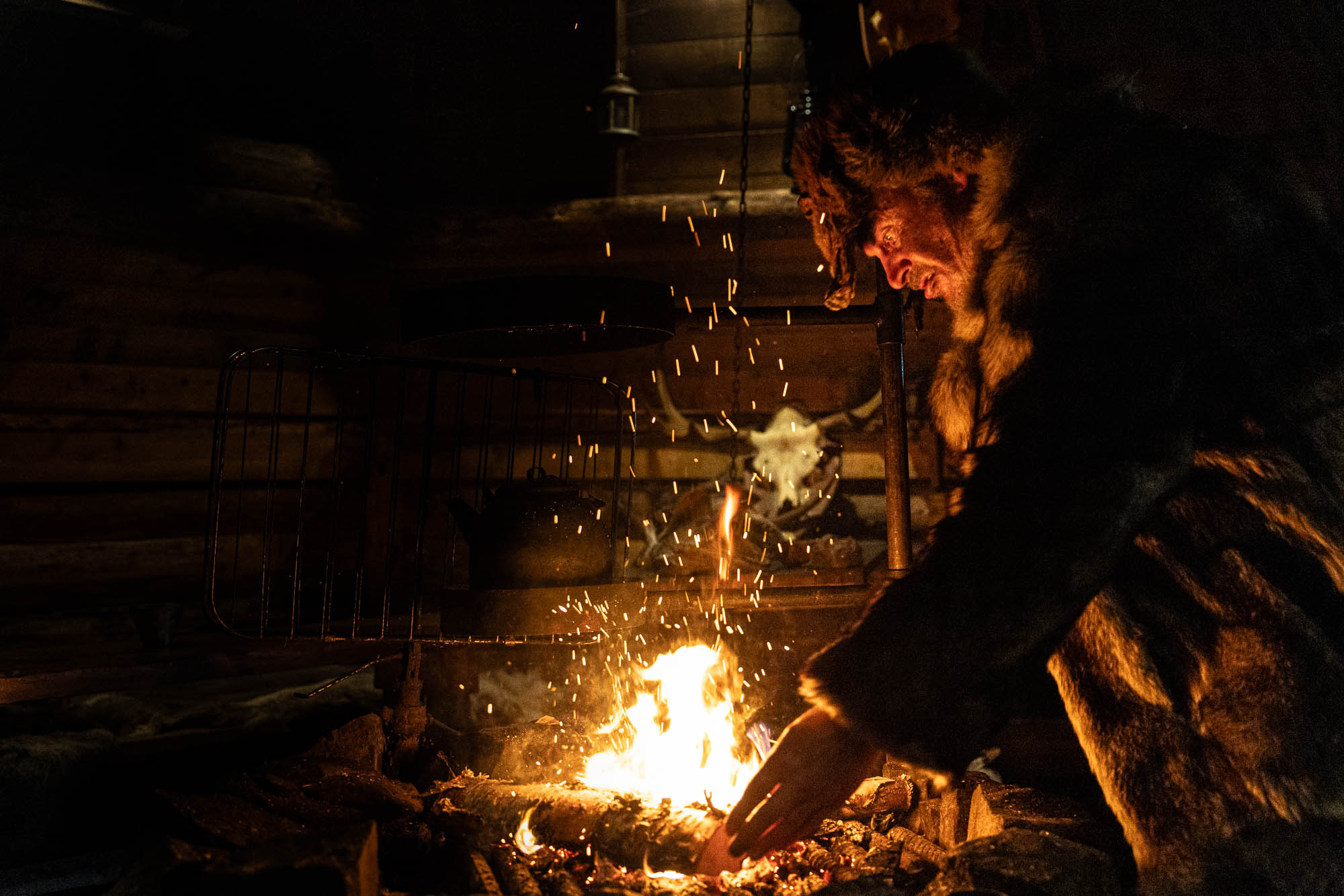 In Finland, saunas are social gatherings, like a trip to the beach or pool back home. Three bare Swiss behinds wouldnโt have exactly helped with cultural exchange! After a refreshing dip in the crystal-clear lake, weโre rejuvenated and ready for a spiritual encounter. A genuine Lappish shaman welcomes us for an audience in his log cabin. The lakeside atmosphere couldnโt be more fitting. The sun shines dramatically between clouds and the treeline, and a cool breeze whips across our faces. We sit inside the fire-warmed cabin as the shaman, a little imposing but entirely captivating, shares stories of his ancestors. We learn about his life as a fisherman and hunter and listen to the legend of how the Northern Lights came to be. โA giant fox prowls through the Polar Winter forest, its tail sweeping side to side. The sparks it creates fly into the sky and appear as the Northern Lights, which we call โFoxfireโ,โ he explains in his deep voice. โIf youโd like, I can call upon the spirits and try to wake the fox,โ he adds. โAbsolutely. Letโs go outside and see if it works,โ Anita replies eagerly. The shaman drums and murmurs, blowing glowing embers toward the ceiling with his eyes closed. A few minutes later, we step out into the night and stare at the sky. And indeed: what initially looks like a veil of clouds reveals itself in the deepening dark as a faint aurora. Not especially bright, but there. โMust be a little fox,โ Caro laughs. Letโs hope we see larger foxes in the nights to come.
