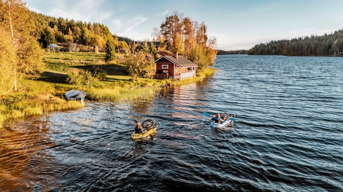The following days are spent seeking out the best gravel trails. Aapo has already shared some of his favourite GPS routes. The Gehrig twins donโt mind the occasional hikeabike section if it means uncovering trail gems that likely havenโt seen many gravel tyres. We cross bridges and pass deep blue lakes, wading barefoot through knee-deep streams at times. โThereโs probably no better place to combine packrafting with biking,โ Aapo tells us as he inflates the small boats. Rather than riding around a medium-sized lake, we decide to paddle across. The inflatable kayaks are new territory for Anita and Caro, but with their compact pack size (about as big as a small sleeping bag), theyโre perfect for land-and-water adventures. Even as paddle novices, they have the boats ready in minutes. After dismantling the bikes and securing them with straps, weโre ready to set sail. The twins love it after their water baptism. โCan we do this again tomorrow?โ they ask Aapo. No problem in the land of rivers and lakes! The next morning, we paddle ten kilometres downstream and ride back to our cabin.
