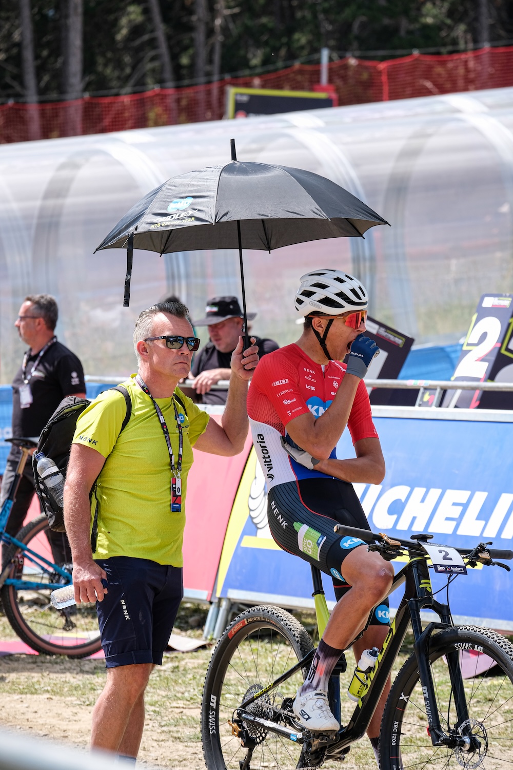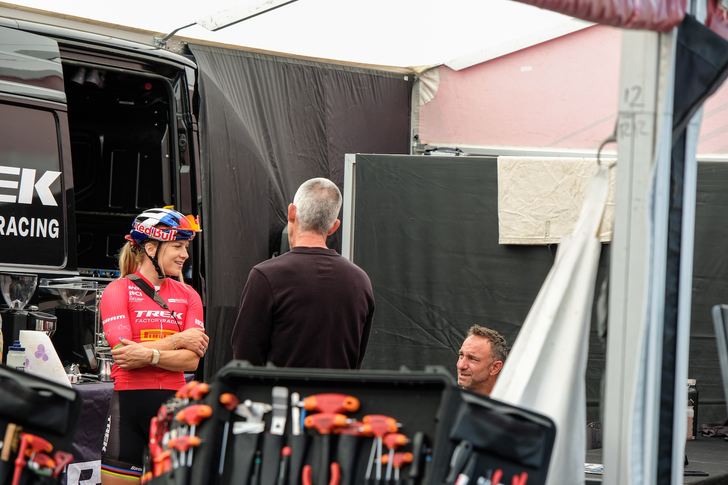 โAll us mechanics all get on. Coming from the road side, itโs different there. Everyoneโs in their separate hotels and no one really mixes. Here in mountain biking, weโre all in the same car park together. Usually Thursday evening, thereโs one team tent, word of mouth goes round to go for a beer and catch up. Youโll have your little pockets of friends where you can go up and borrow spares to make everyoneโs lives a little easier.โ