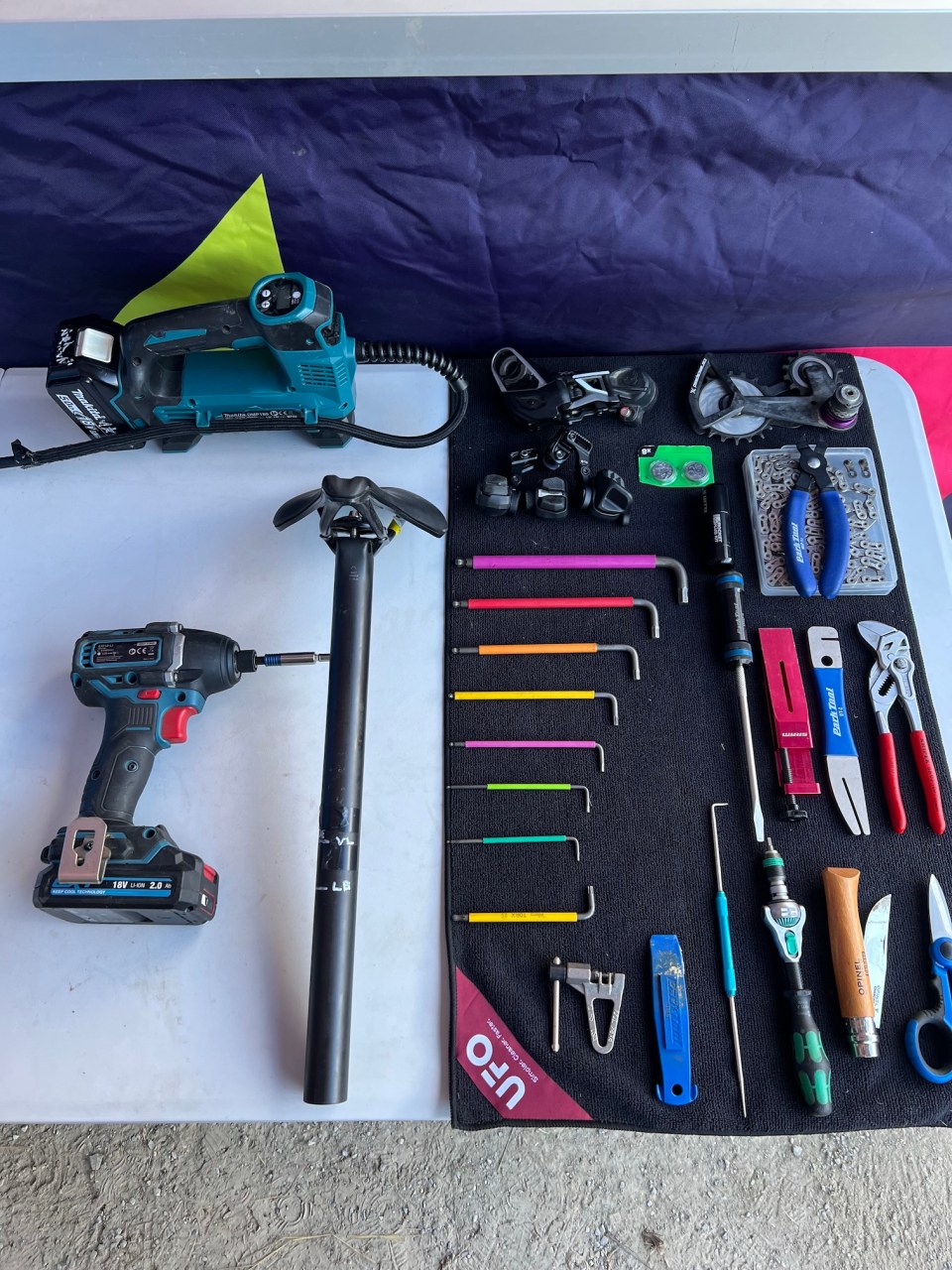 Full gas. It depends what time youโre racing. Youโre here early in the morning. Over and back to the pits. You go to the start and then thereโs the feed and tech zone. Iโll give the soigneurs a hand with the bottles and stuff. I know how they work and what they need. If youโre just standing around waiting for a puncture, itโs going to be a long day, so you chip in and help out with the start line and the rollers and stuff. Spares โ youโre covered for every eventuality. Youโve got a rear mech, cage, chain, quick links, chain.