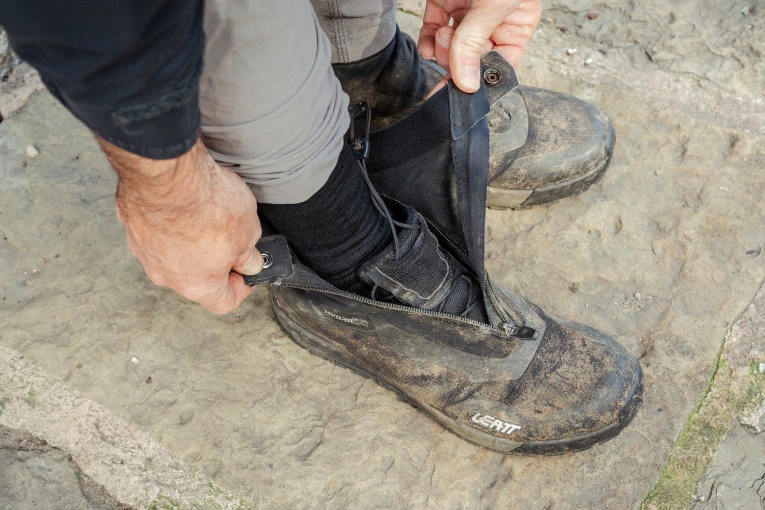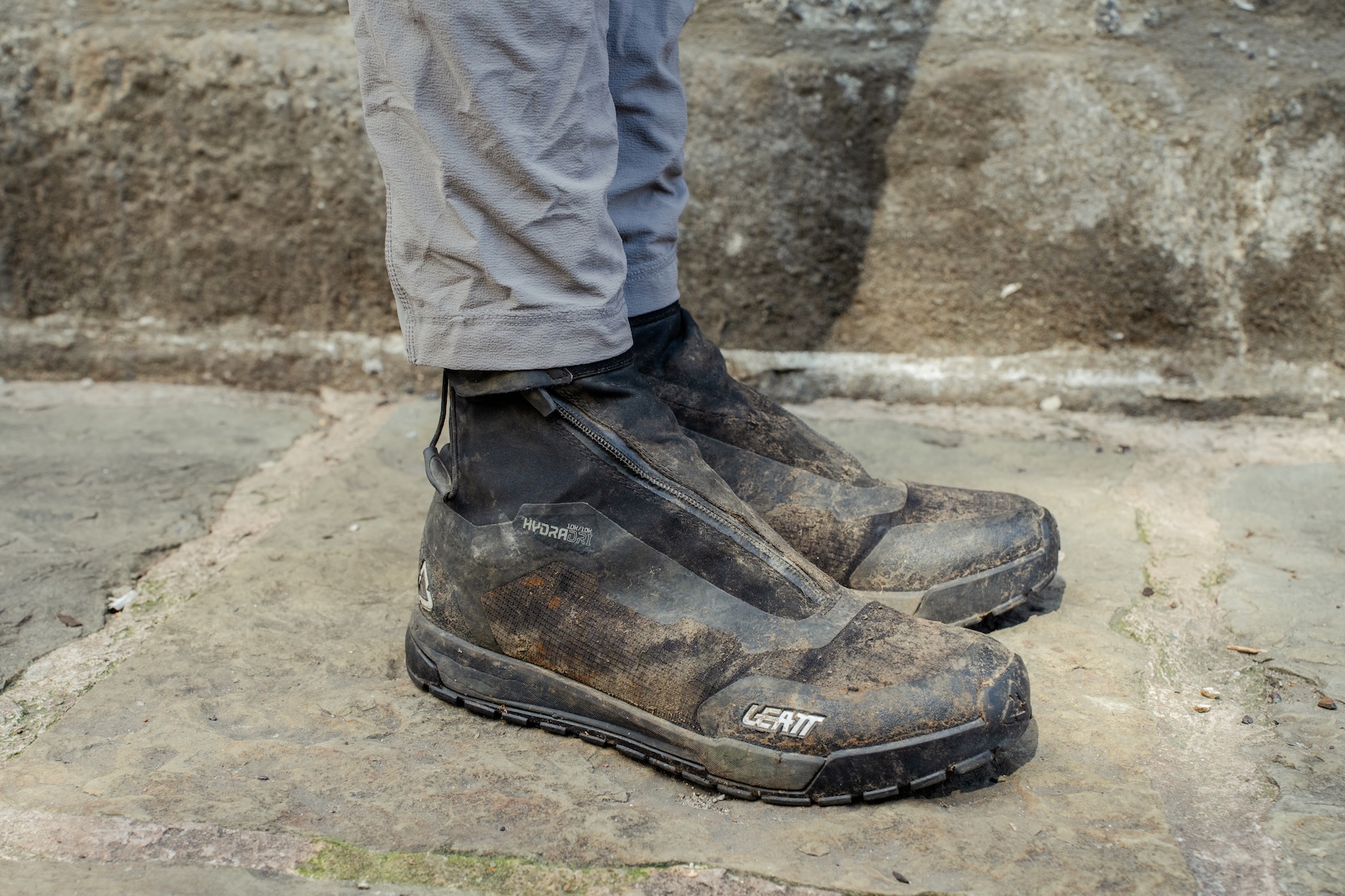 These arenโt a new product. They are the very same shoe as weโve reviewed and recommended in previous wintertime issues. And still nothing has knocked them off their perch. You can keep your Gore-Tex shoes. Good luck with Primaloft as an upper lining. Neither of these materials work. Not on the end of your leg anyway. The genius of the Leatt HydraDri shoes is that they are essentially shoes (not boots) with an integrated boot-high overshoe. The overshoe is also nicely tapered and close-fitting above your ankle bones. Paired with a decent a pair of riding trousers, water has a devil of a job getting in to the top of these shoes. And the overshoe layer does incredible work at keeping your feet from getting cold. Get half a size up a pair them with waterproof socks if you really want to keep nature at bay. They may not have the outright pedal traction of other brands but itโs good enough, and staying comfortable is way more important in the grand scheme of things.