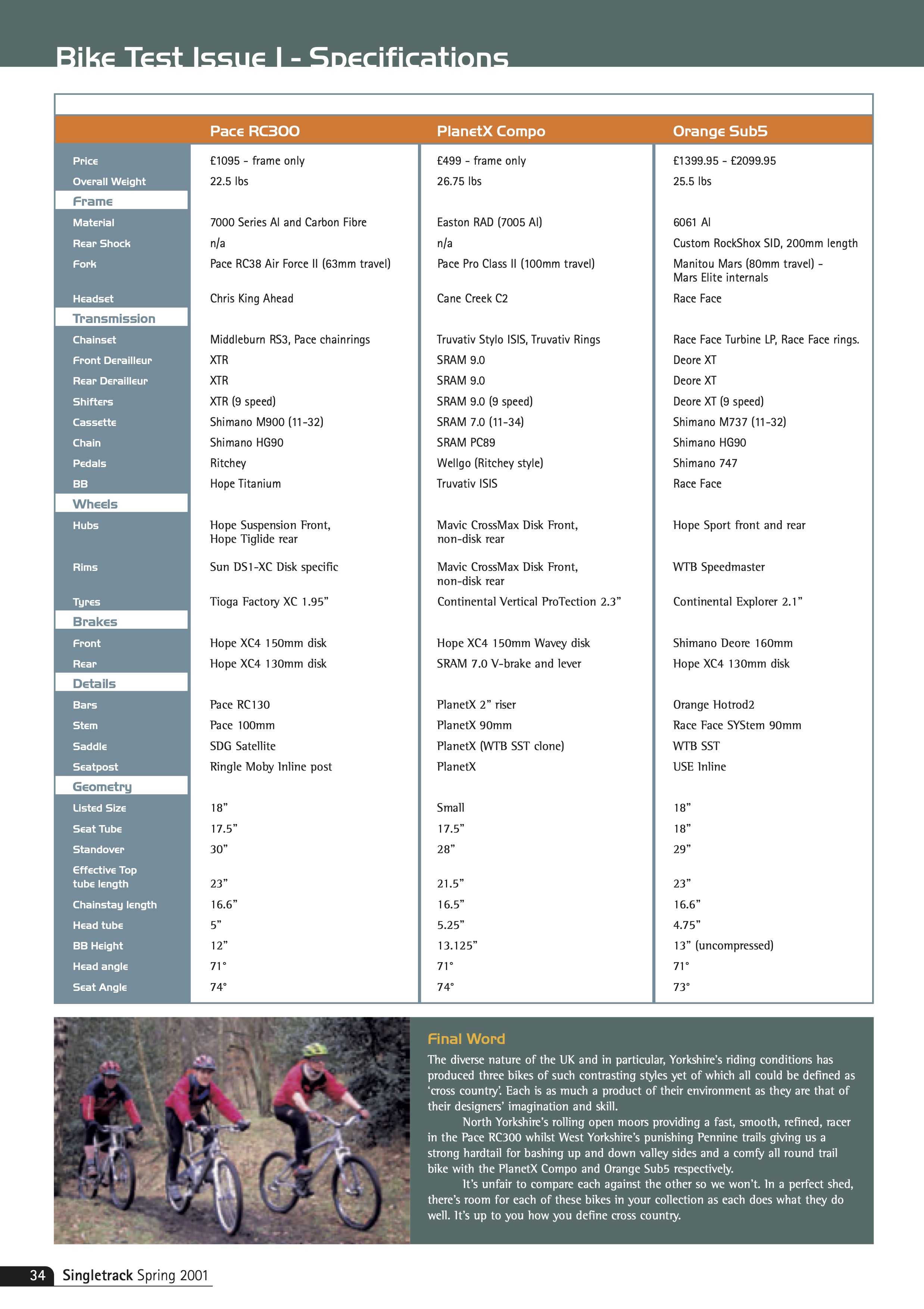 North Yorkshire’s rolling open moors providing a fast, smooth, refined, racer in the Pace RC300 whilst West Yorkshire’s punishing Pennine trails giving us a strong hardtail for bashing up and down valley sides and a comfy all round trail bike with the Planet X Compo and Orange Sub5 respectively.