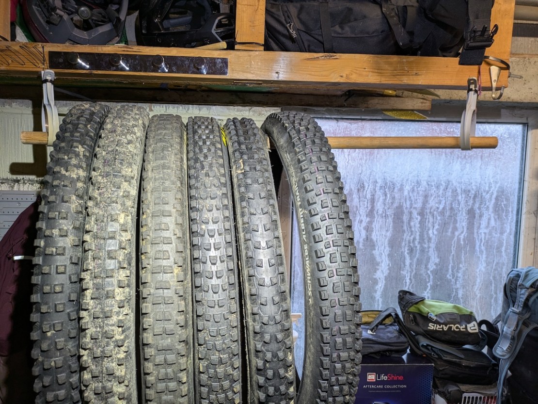 Tyres, eh? Love them or like them, they can be a pain to store. Especially when you have flipping loads of them. Even the most seasonal of tyre swappers – after consigning the summer tyres into the shed (or similar) – will still have a small bunch of wintery tyres kicking around the place. Hence, this stunning ‘solution’ above. A classic of scavenge fabrication, featuring a broom handle, drainpipe brackets and the obligatory zip-ties, I am very pleased with my handiwork. As of Friday morning, it has not fallen down. For 100 internet points, successfully identify the tyres above (not including Schwalbe Albert Trail!)
