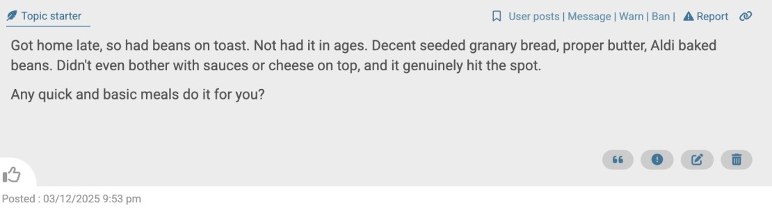 This week’s winner is MoreCashThanDash for the rather eye-opening Strangely satisfying basic meals thread: