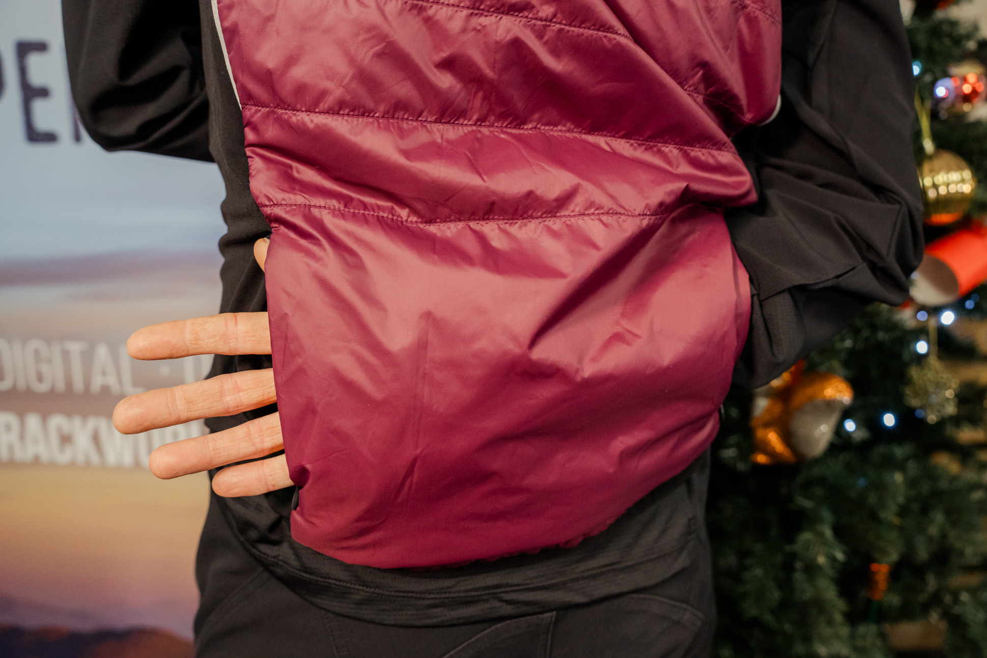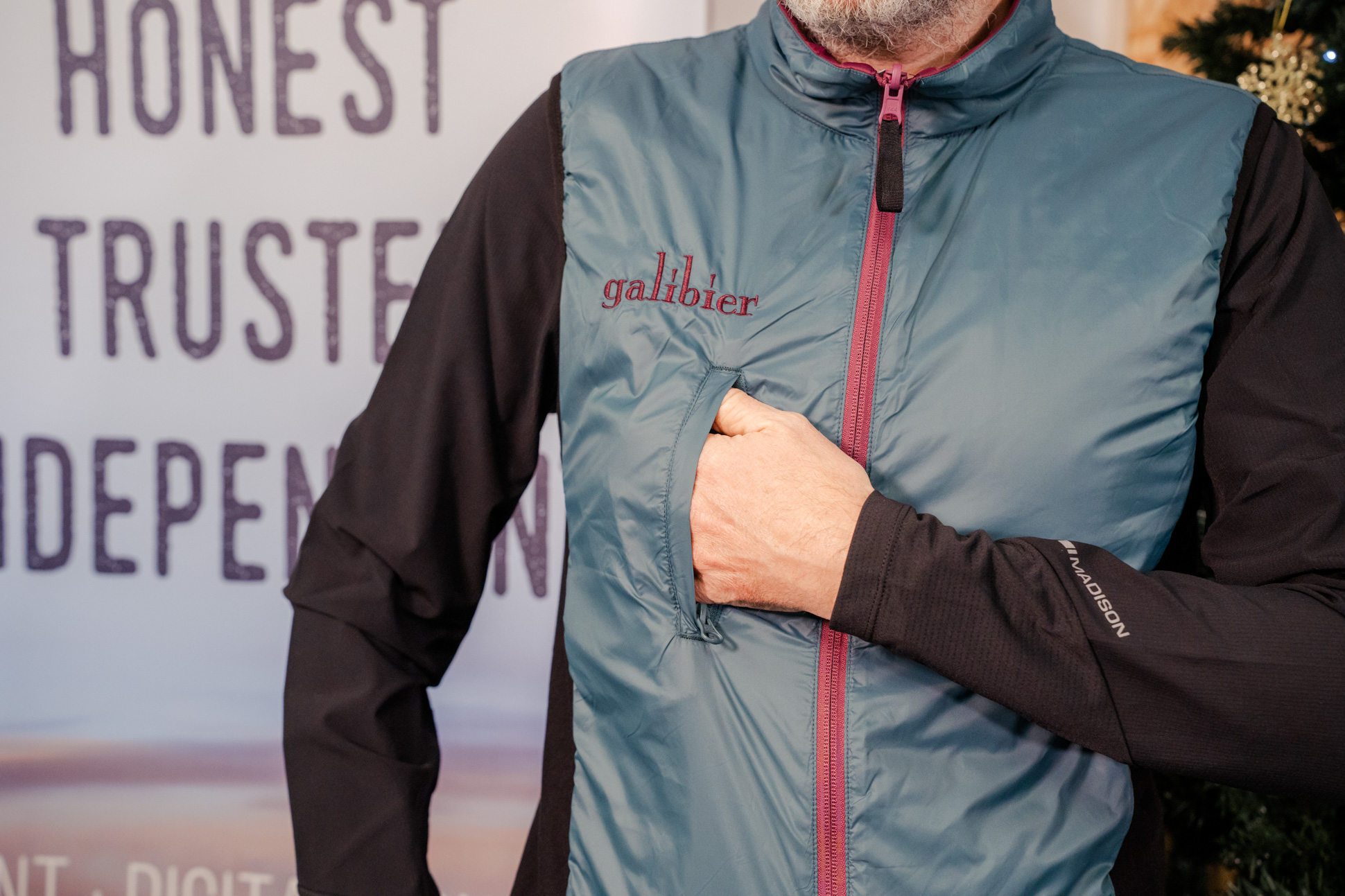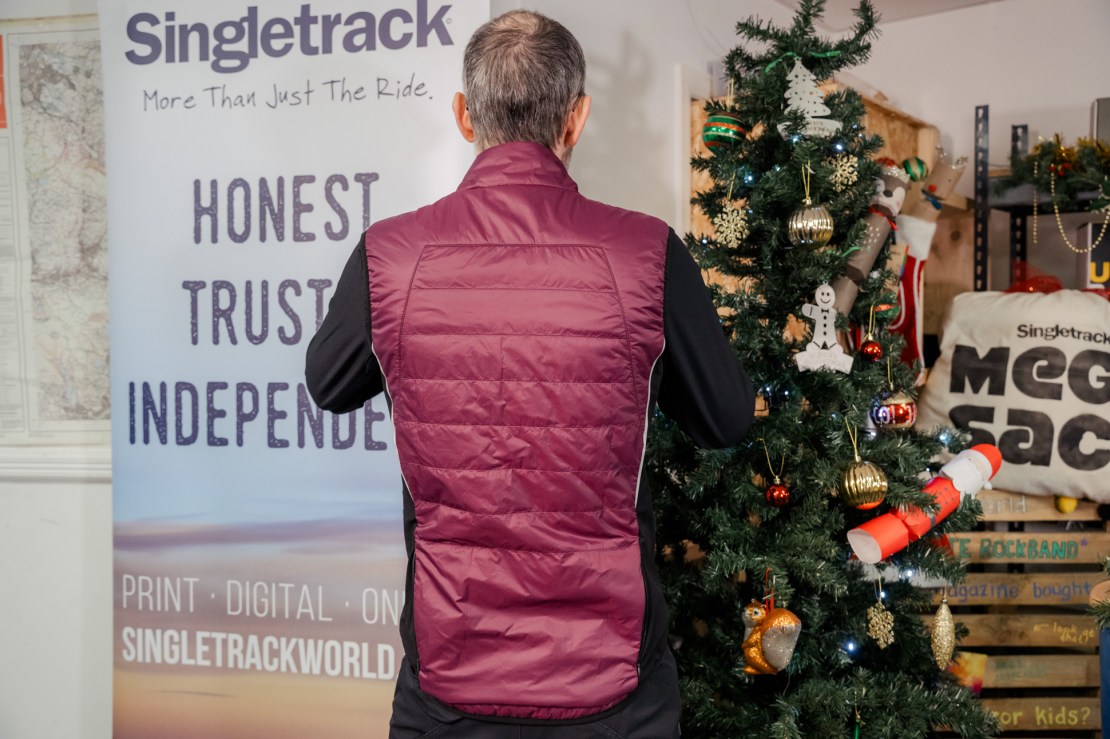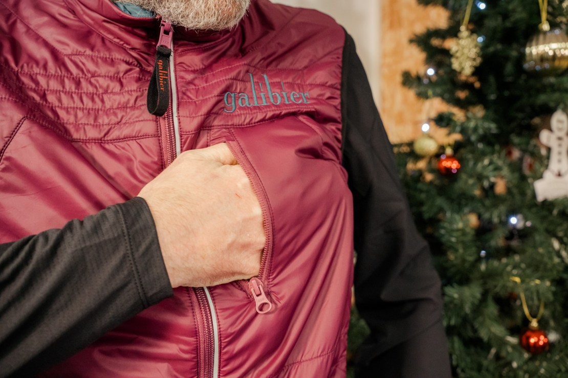 One of them thar insulated gilets. Reversible design (but bear in mind the rear pocket only functions when worn the ‘beetroot’ side out). Main fabrics are100% recycled, made from plastic bottles. There’s water-resistant DWR-coated outer shell. Uses 35g/m Active Sport recycled synthetic down insulation.
