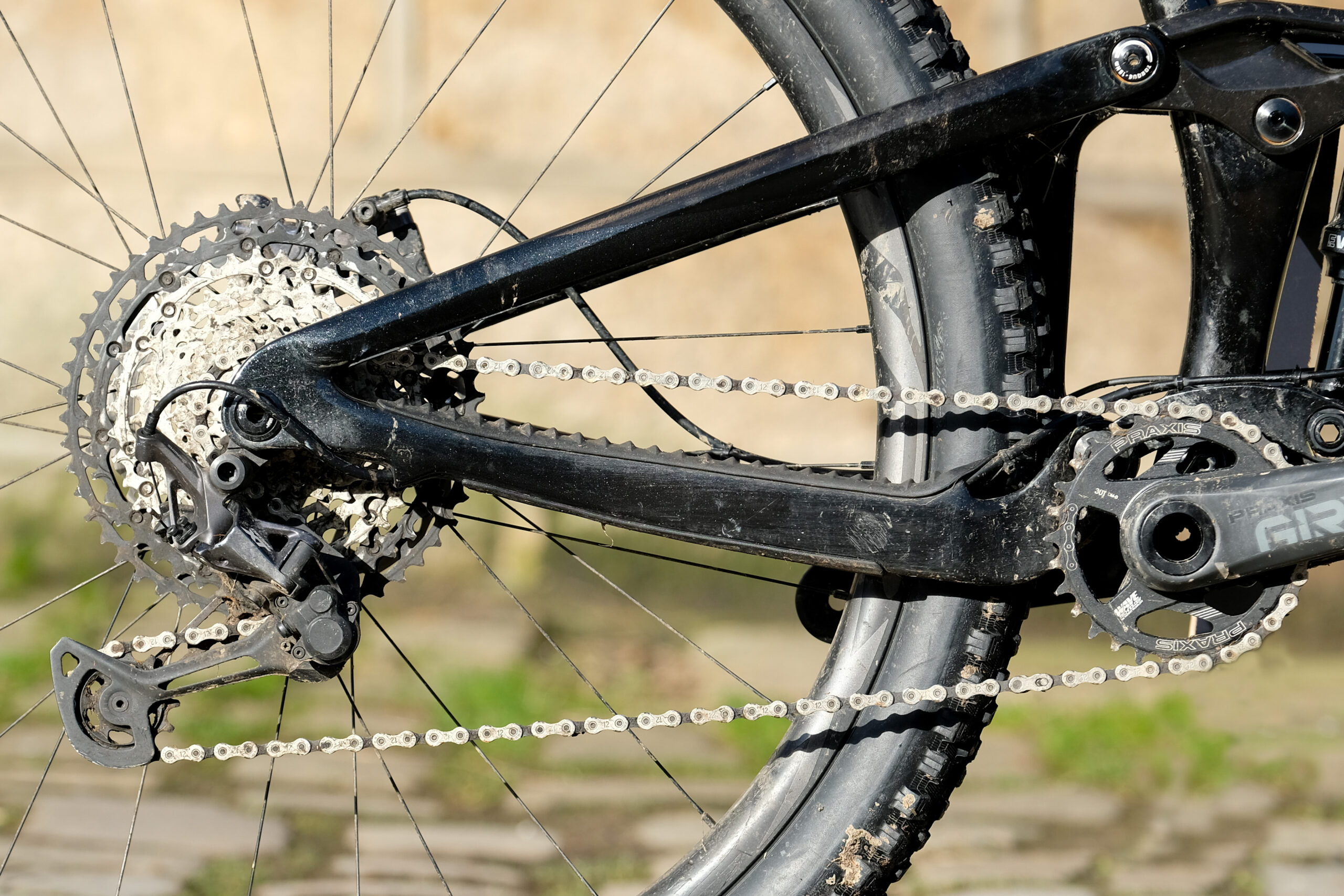 Shimano provides the braking with a set of XT 4-piston brakes clamping onto 180mm rotors front and rear. Shimano also takes care of the drivetrain with a 12-speed XT drivetrain mated to a Praxis Girder carbon crankset.