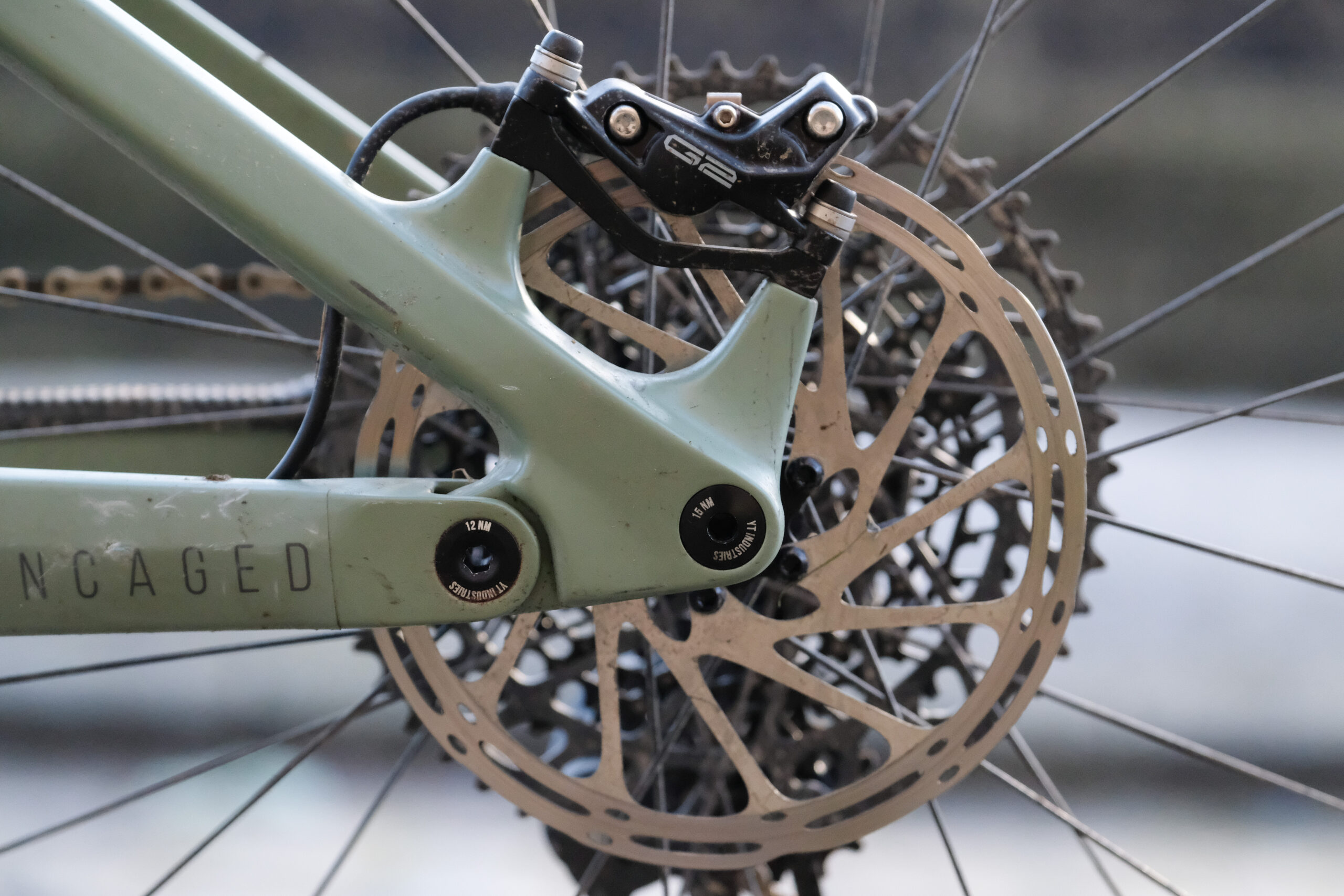 On to the details then. The frame is virtually entirely carbon. The linkage and assorted hardware are aluminium. The Izzo is impeccably modern. As well as being none-more-carbon, it has fully internal cable routing, a PressFit 92 bottom bracket, room for water bottle, accessory mounts under the top tube, bespoke frame protection and a flip chip (albeit a flip chip that is typically redundant because it doesn’t alter the geometry very much and no one will ever run in it ‘high’ setting anyway).