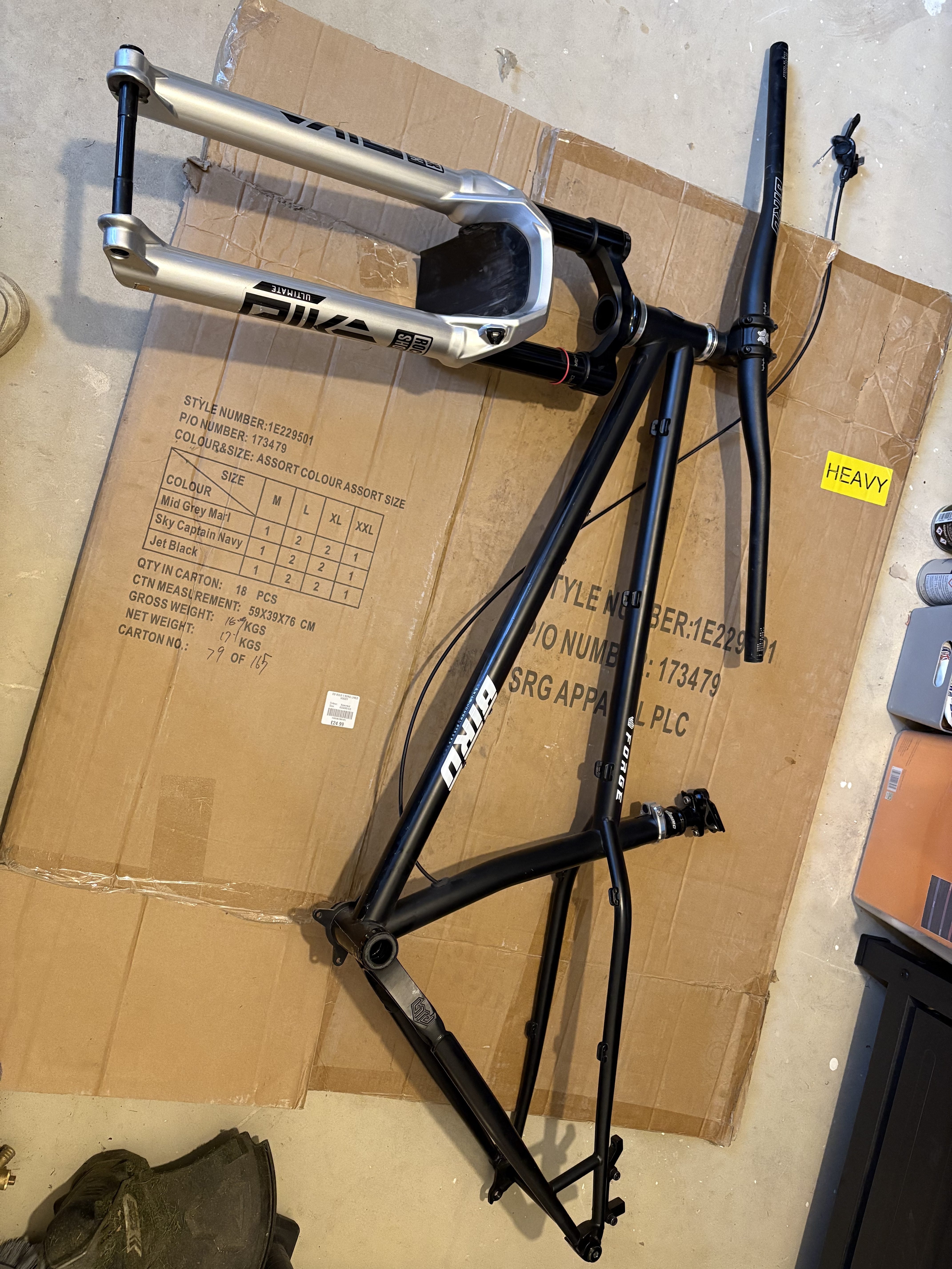 - Bird Forge 29” Steel Hardtail frame inc. Rockshox Pike ultimate 140mm forks, Bird 180mm dropper, Bird stem and handlebars £800