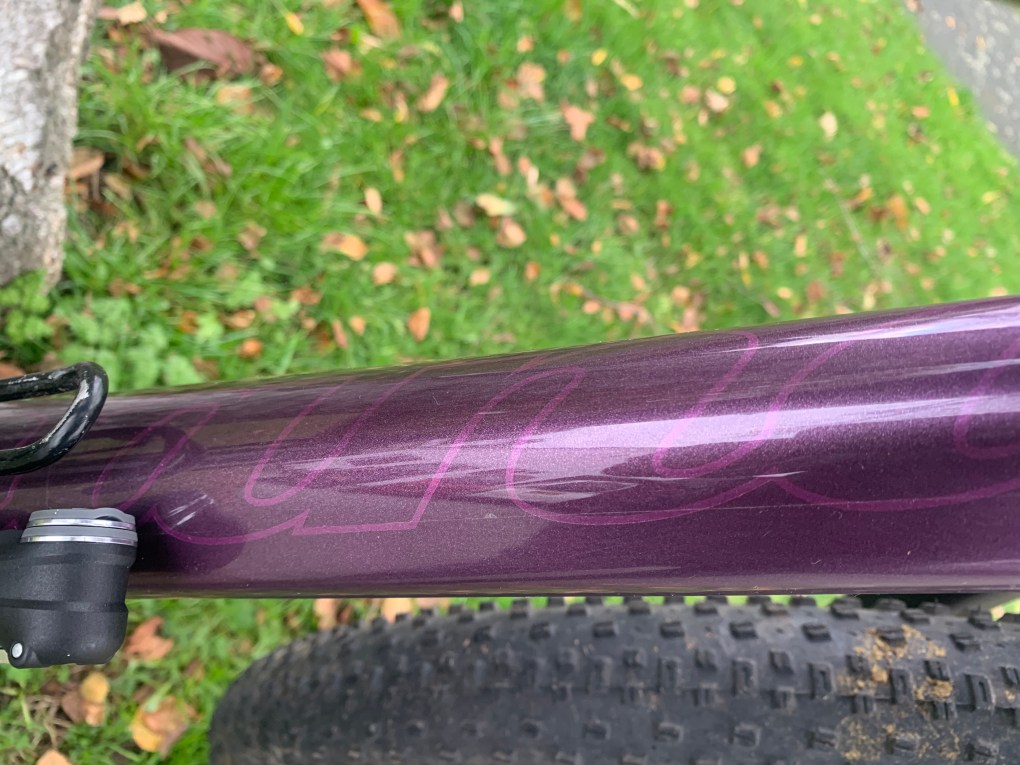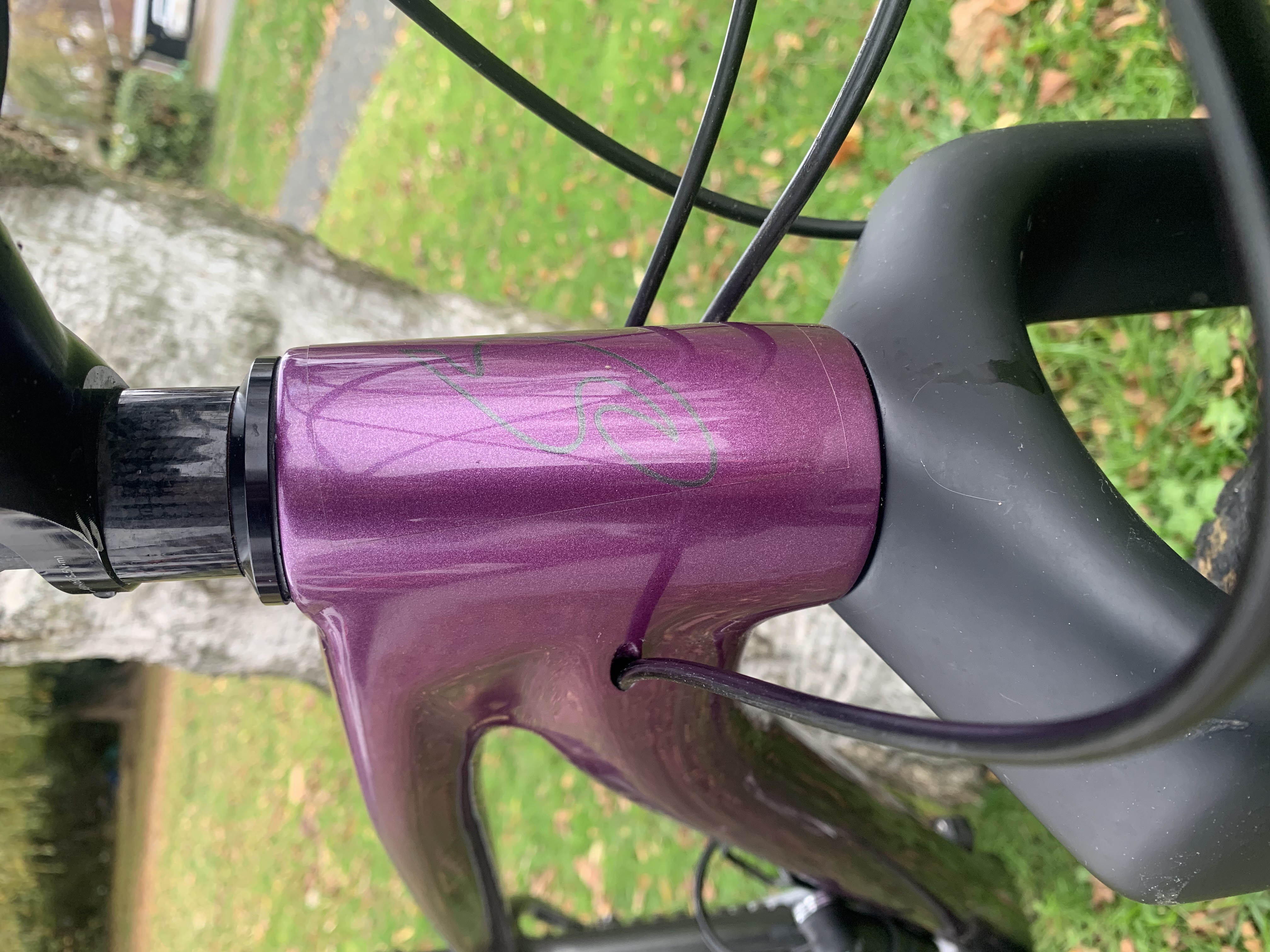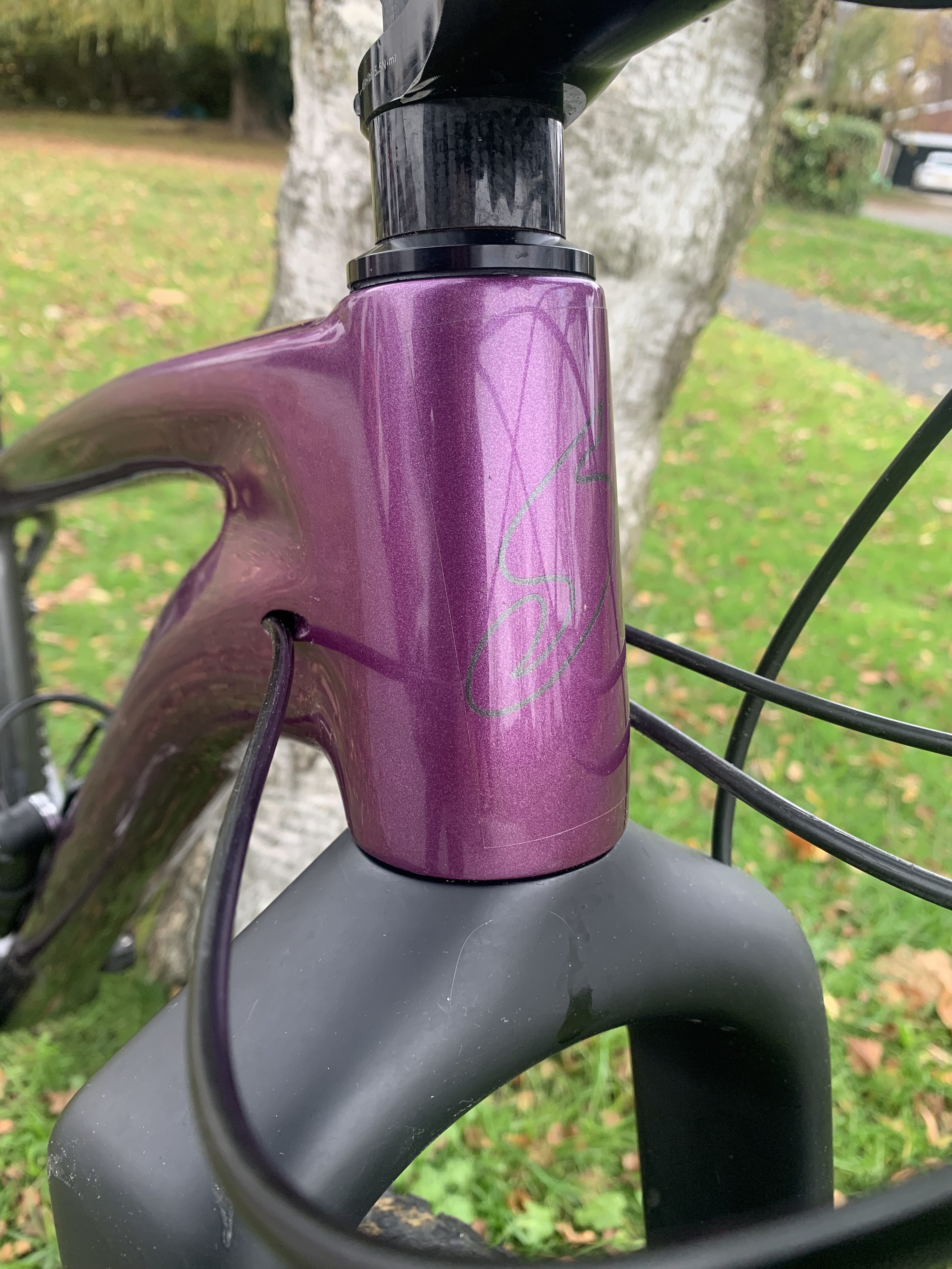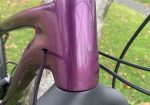 – Shand Oykel full carbon frame in custom purple and grey fade paintwork with the Shand logo in the paint on the down tube and head tube, and a picture of Steven Shand in the paint on the back of the seat tube/BB junction (these are very hard to photograph but look stunning in real life!). There are a few small scuffs and scratches but no knocks or damage to the carbon. The top tube and the graphics to the head tube and down tube are all protected by helitape.