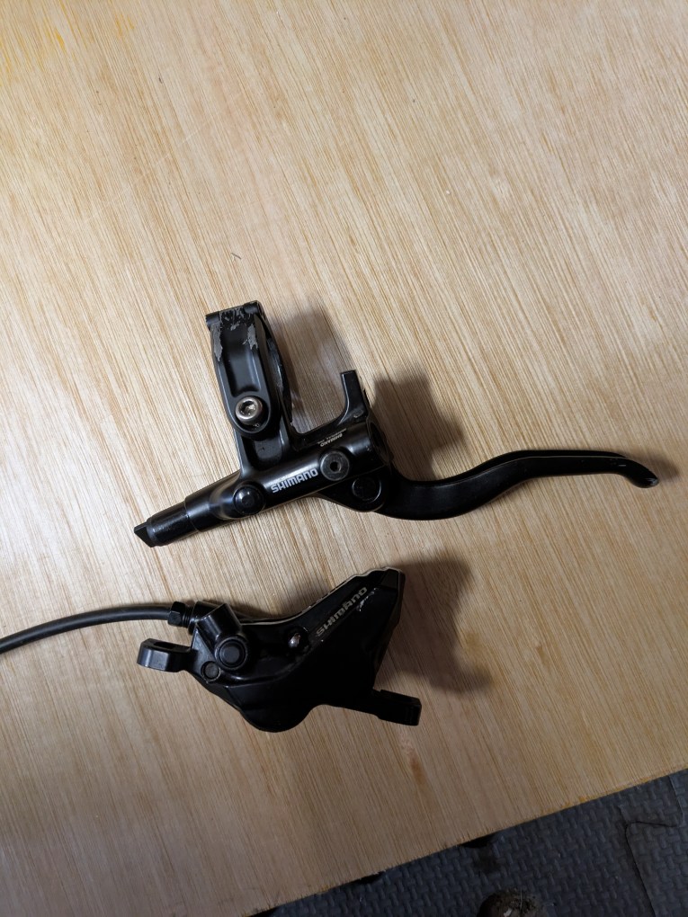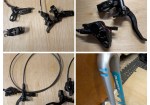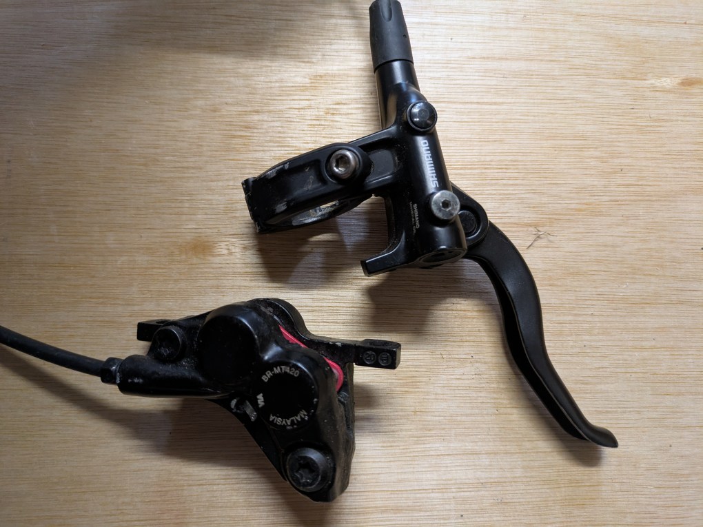 Shimano MT420 4 piston brakes. Removed from a bike I got off a mate, as I had others, they work but squeal like pig doing it with a goose. Front is connected up, rear will need olive & bard and bleeding. Brand new pads. £25 posted for the pair. SOLD.