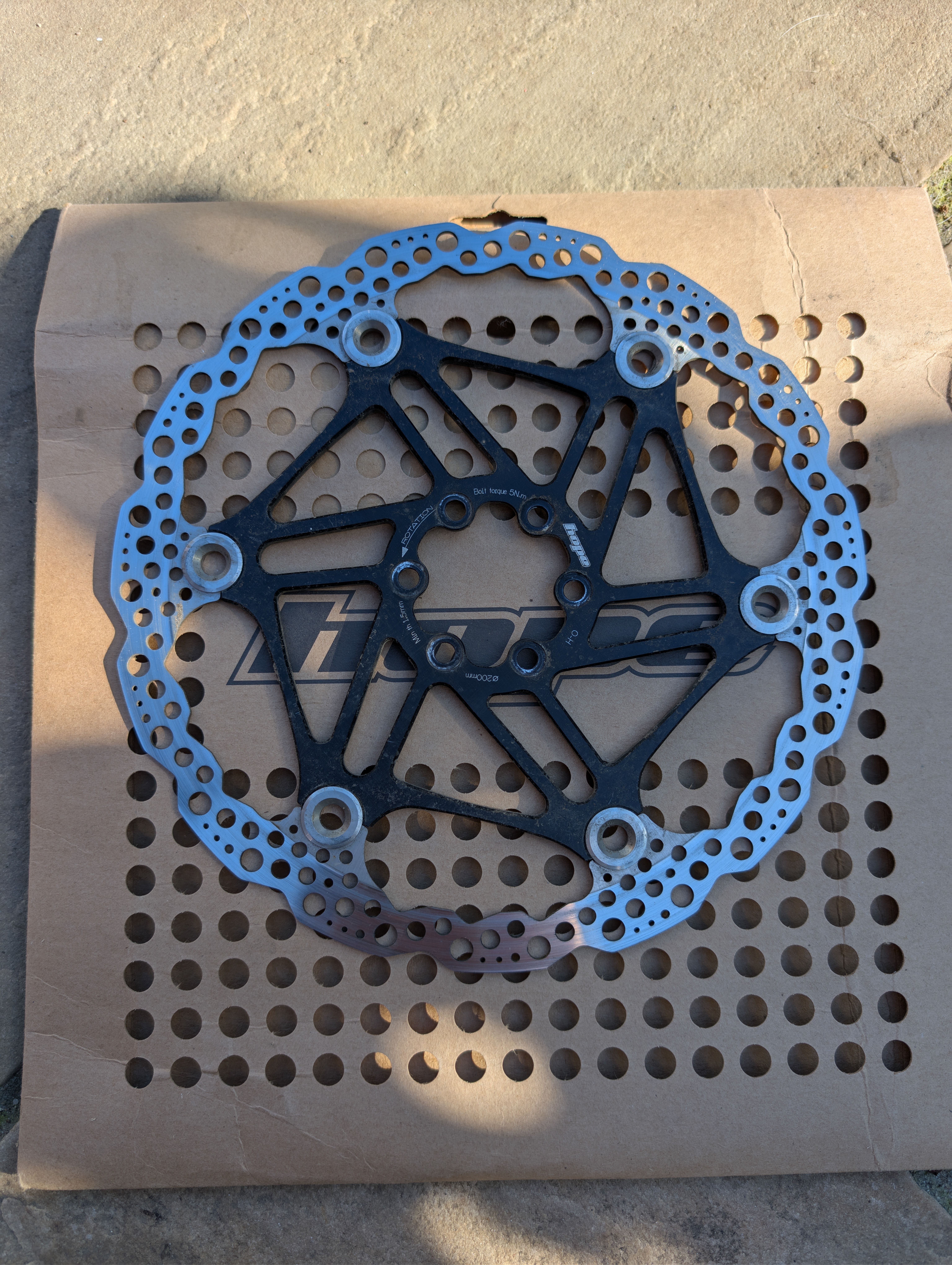 Hope 6 bolt 200m floating rotor. Has been used but plenty of life left, with no warping or wobbles. Selling due to being replaced a while back, so has sat unused.Â