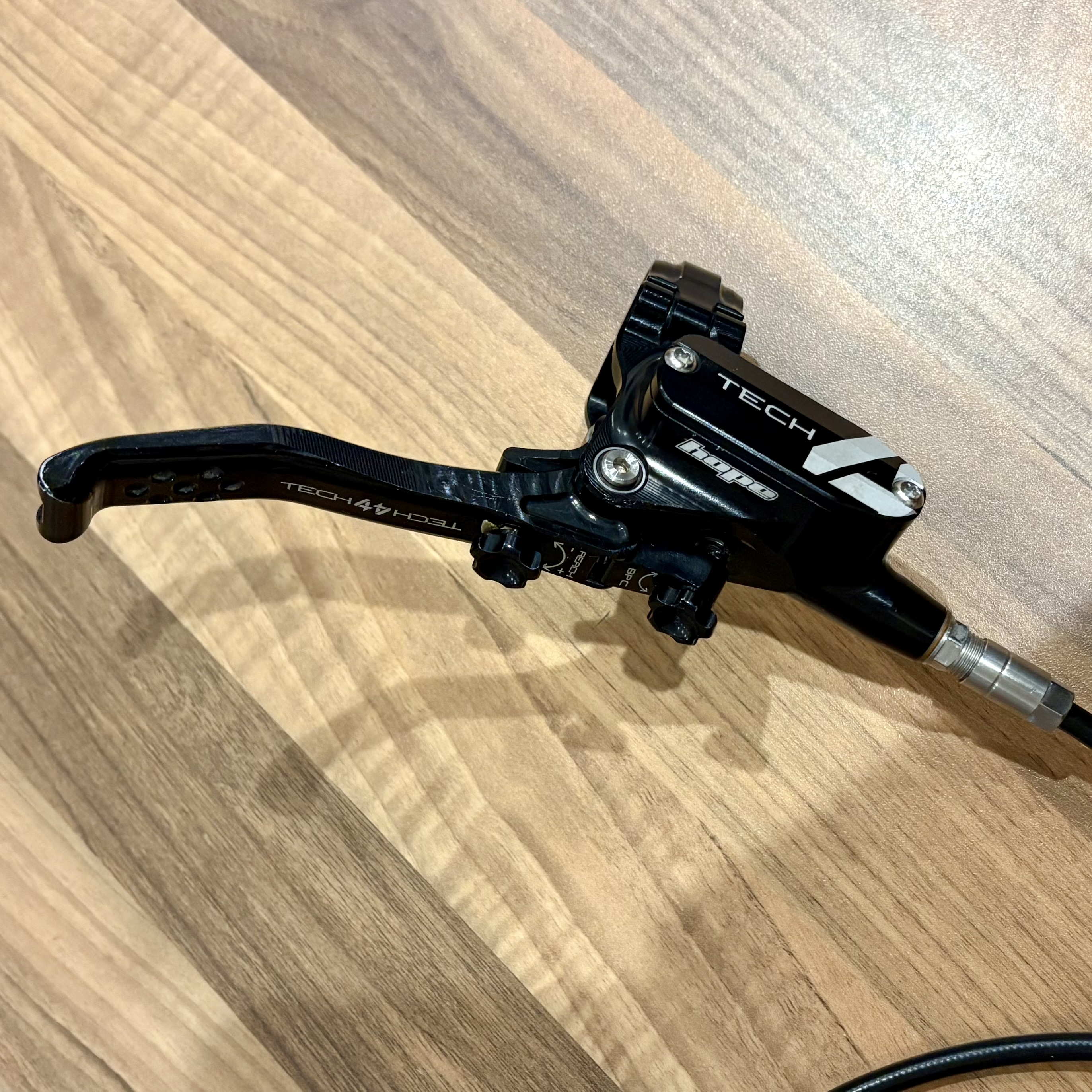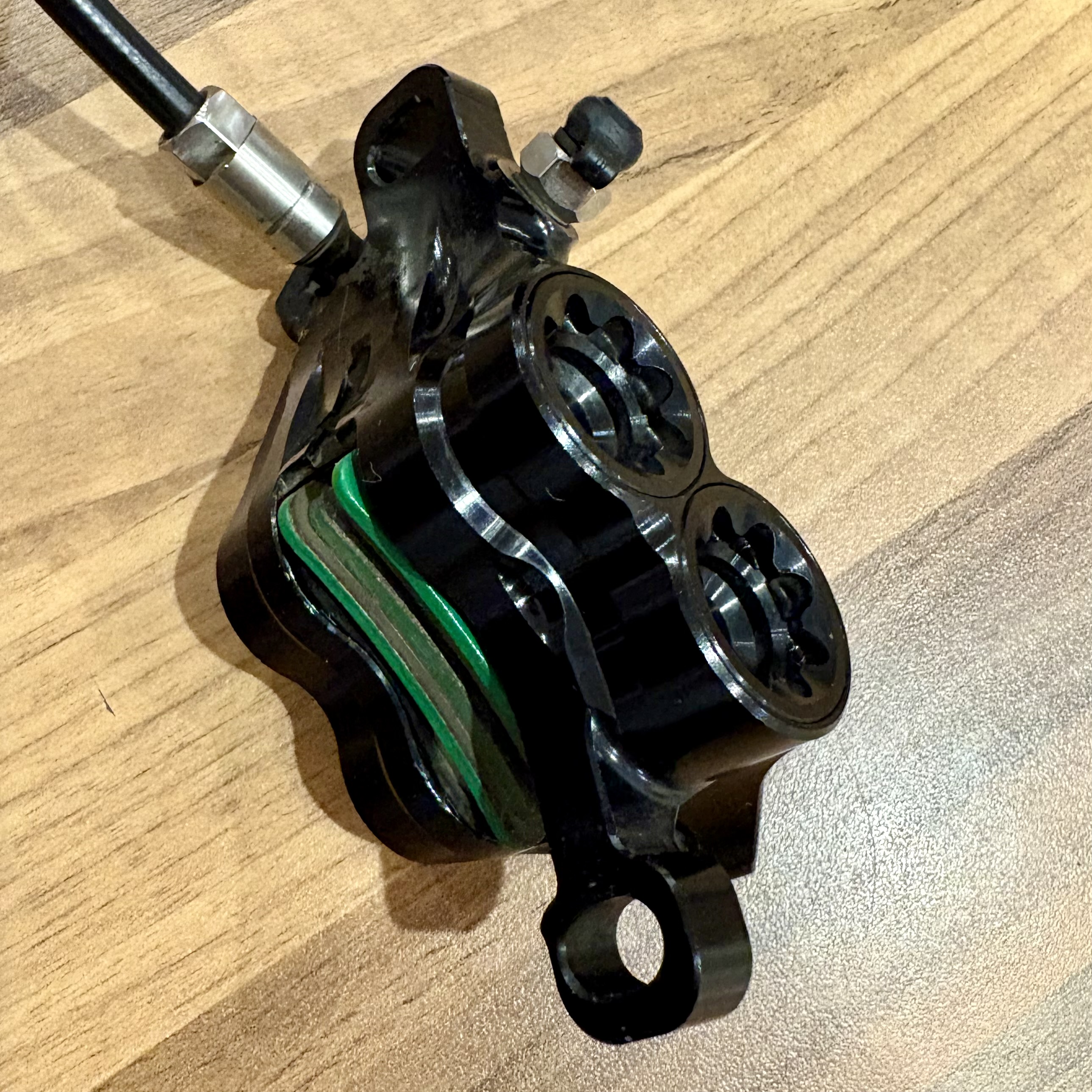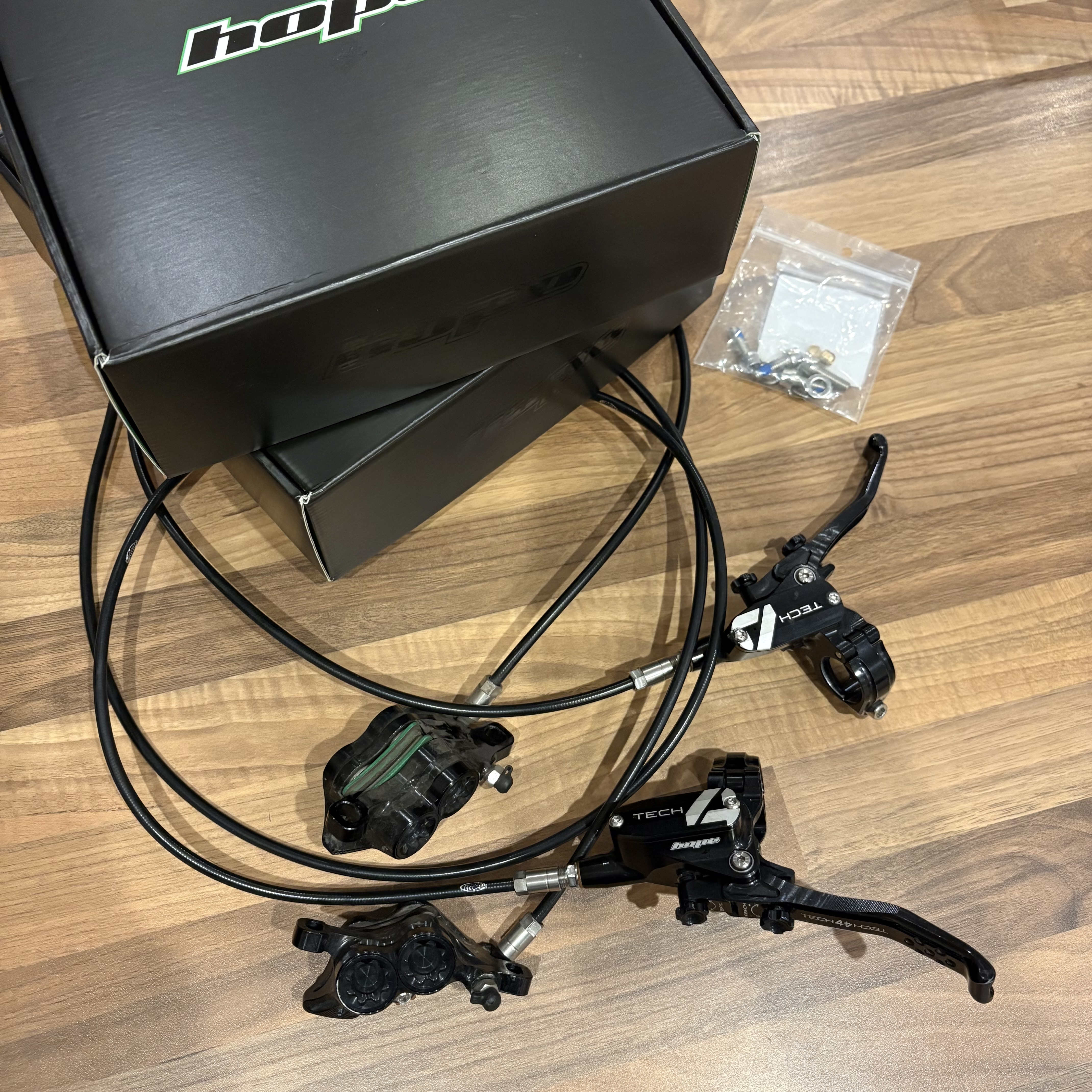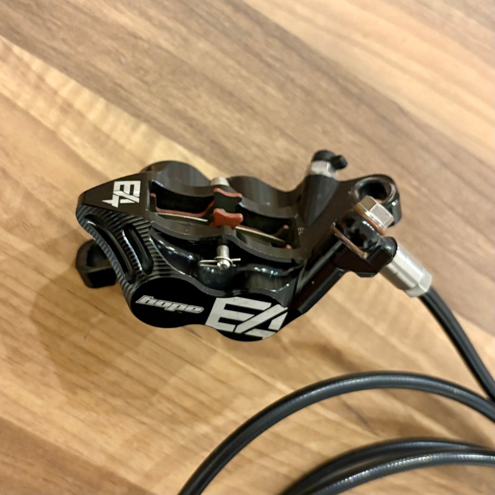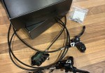 Black with standard black hoses. No major marks, just a few light signs of wear. Great condition overall. Came off a large hardtail, 68cm front length hose and 165cm rear. Green pads front, red pads rear which both have plenty of life in them. Rear will need bleeding as it was removed from an internally routed frame. Couple of olives and bolts included in the boxes.