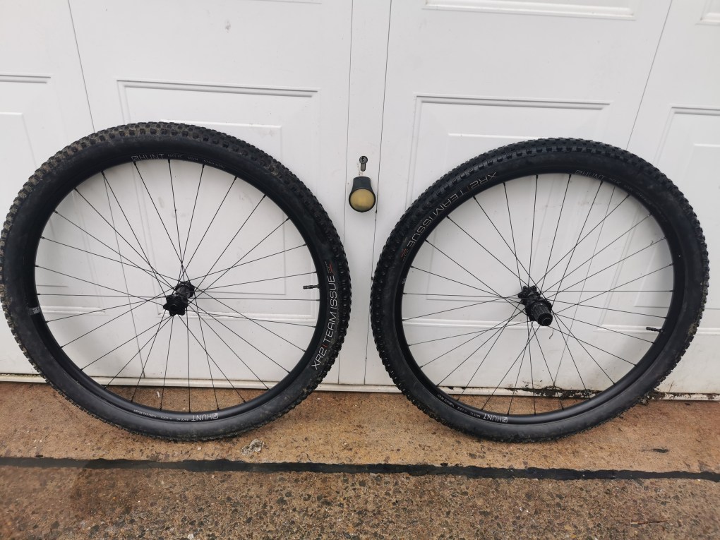 Set up tubeless, I just cleaned and refilled the rear, the front could probably do with attention. Tyres are pretty worn but unless you specifically don’t want them, they’ll stay on the wheels.Â