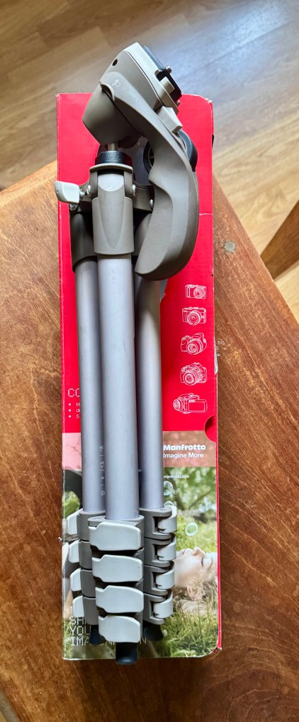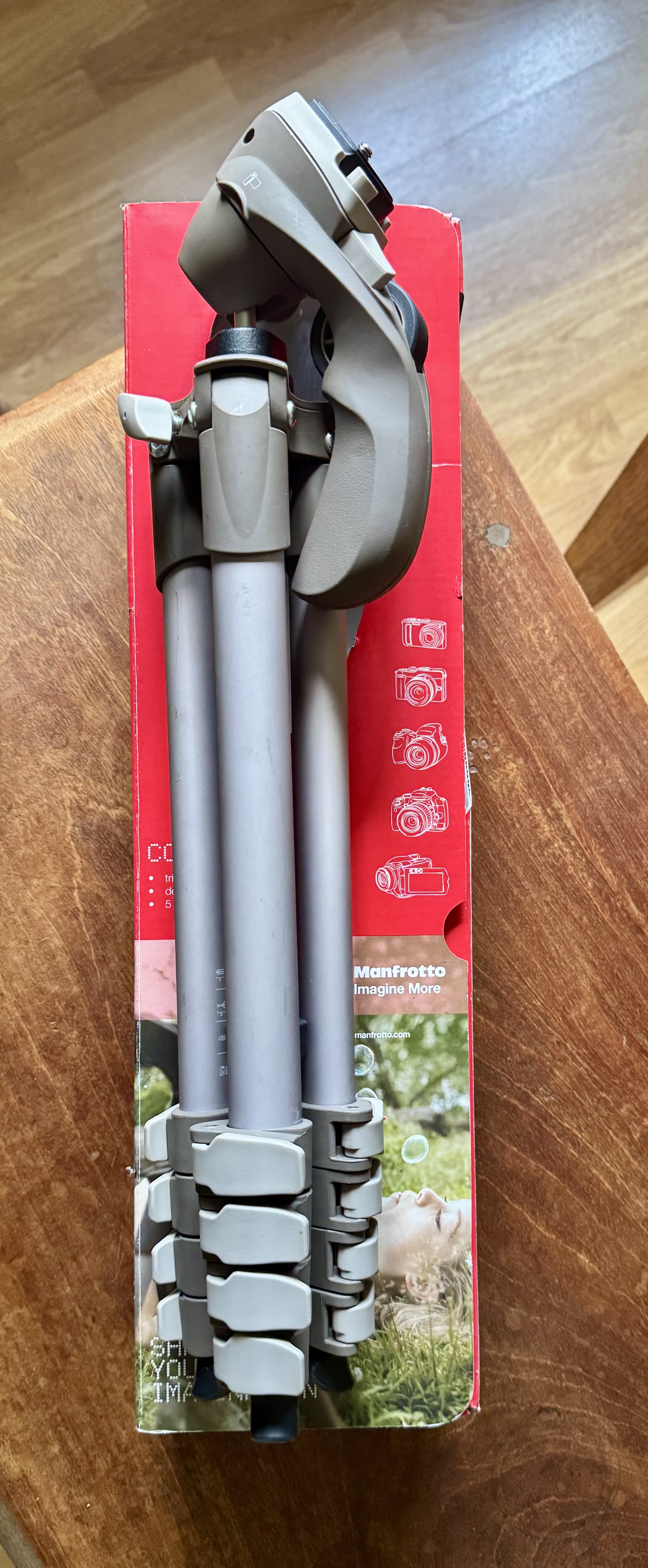 Manfrotto compact series tripod. As new, I don’t think it’s ever left the house. Extends to 5 feet tall. Boxed with tags and manual.