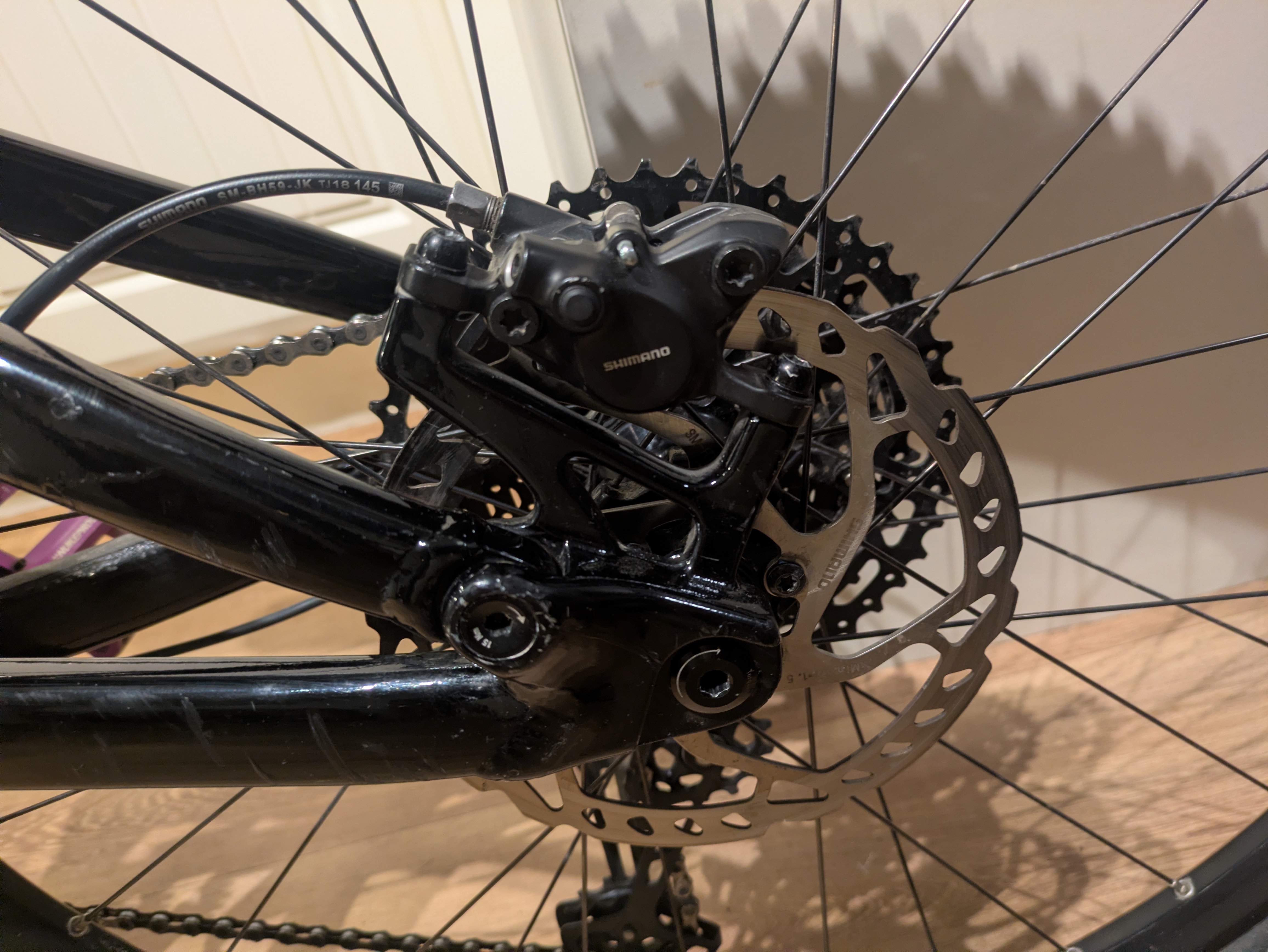 Brakes are Shimano MT200 and work well, 180mm rotor front, 160mm rear. Just been bled and plenty of pad life life.