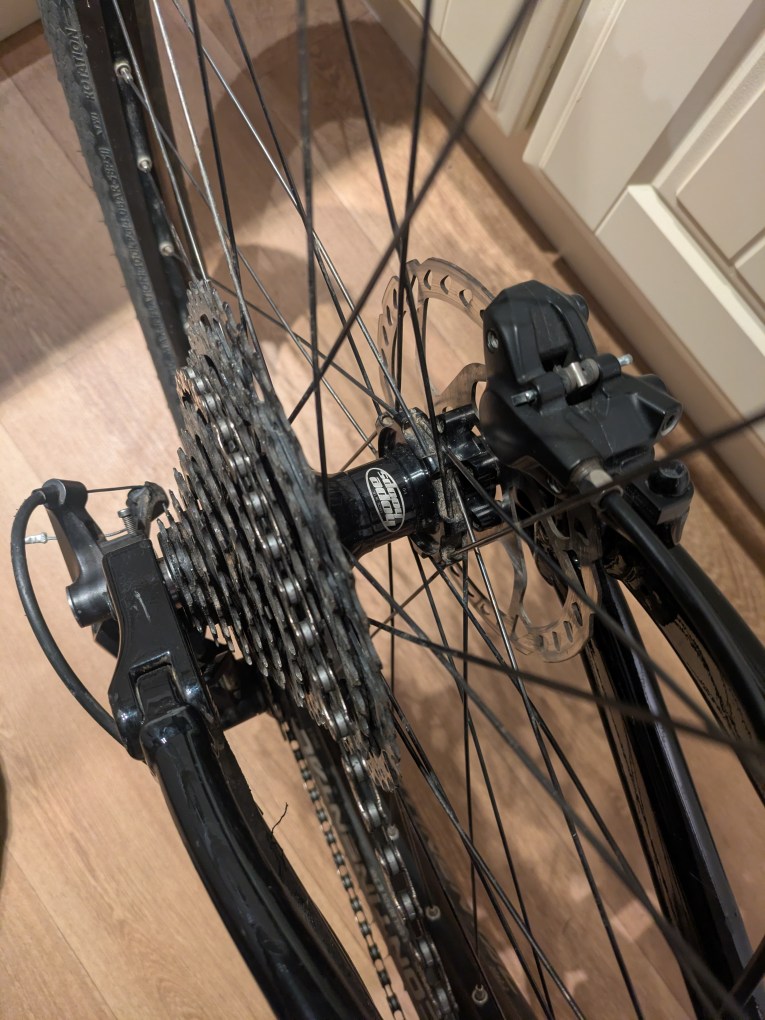 It has 11 speed Shimano gears with an almost new Deore rear derailleur (the original broke). Gears all work well, recent cable.