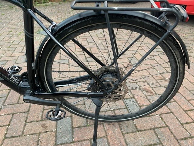 I have added a frame top bag to carry things like keys etc. it’s water proof. I have also added a knog bell. I recently replaced the chainset with a Shimano Cues item, as the original chain ring was worn and being an odd bolt pattern was hard to find a replacement. The Shimano item is better quality and far easier to get spares for. The bike also had a new chain.