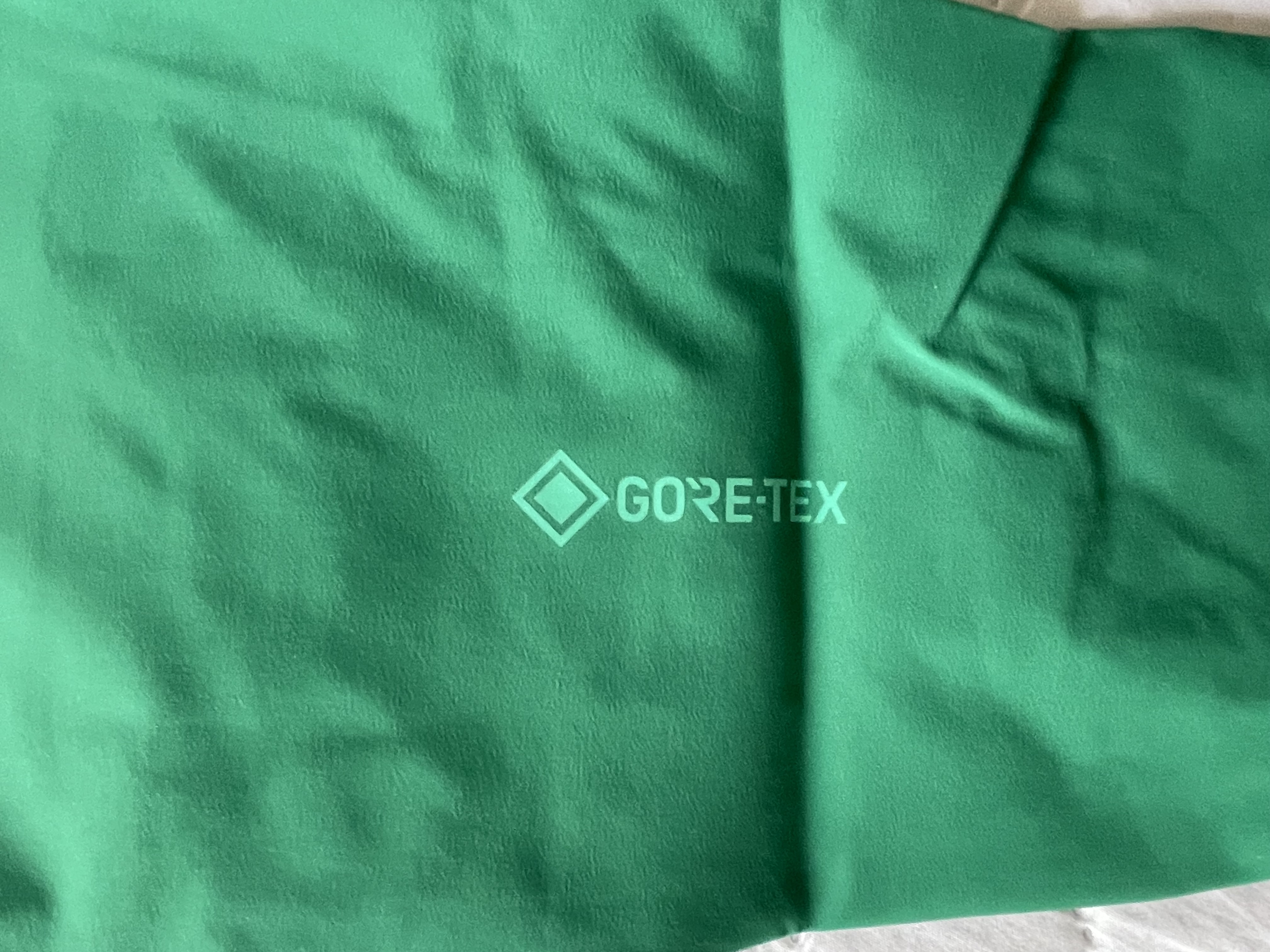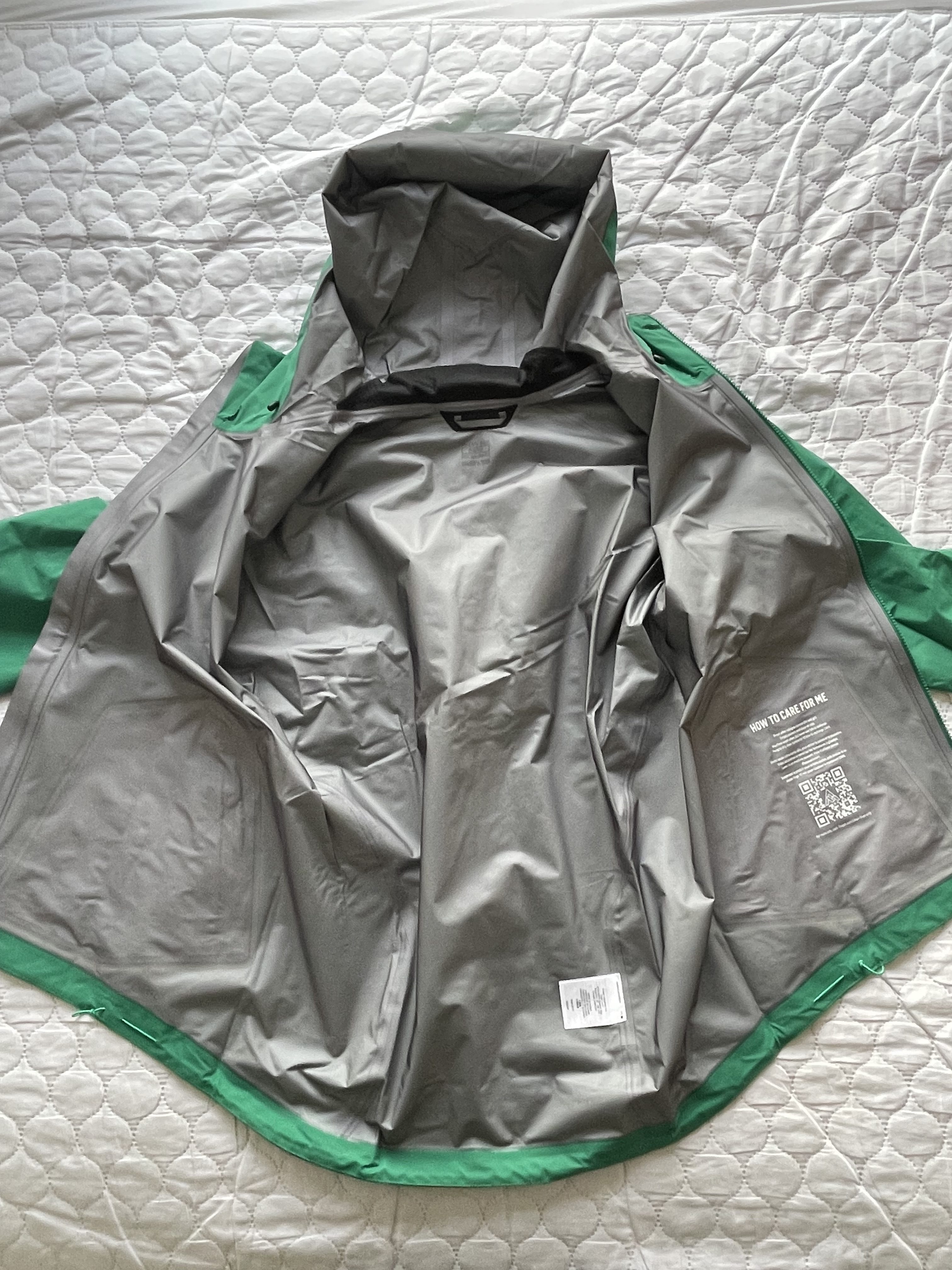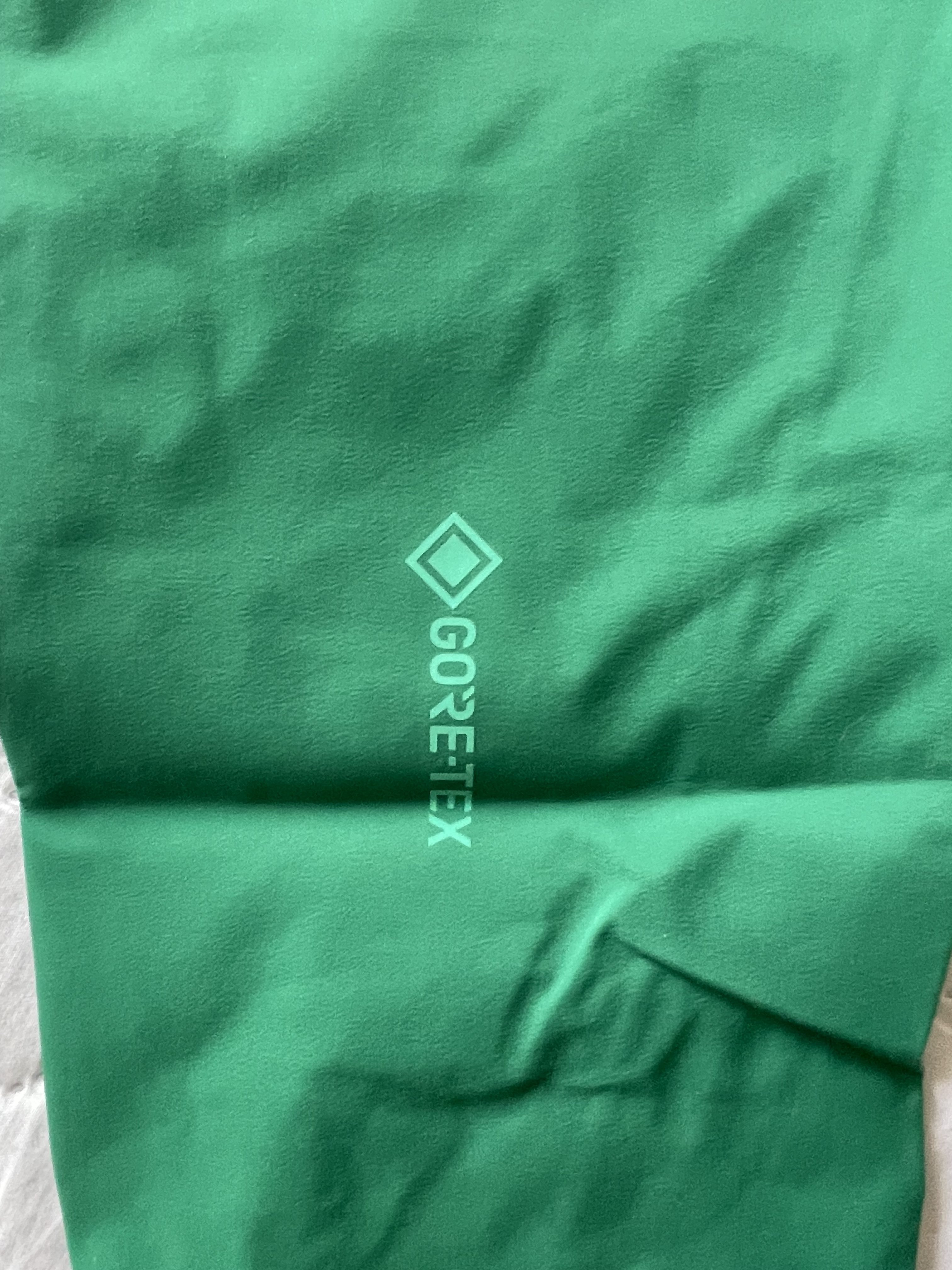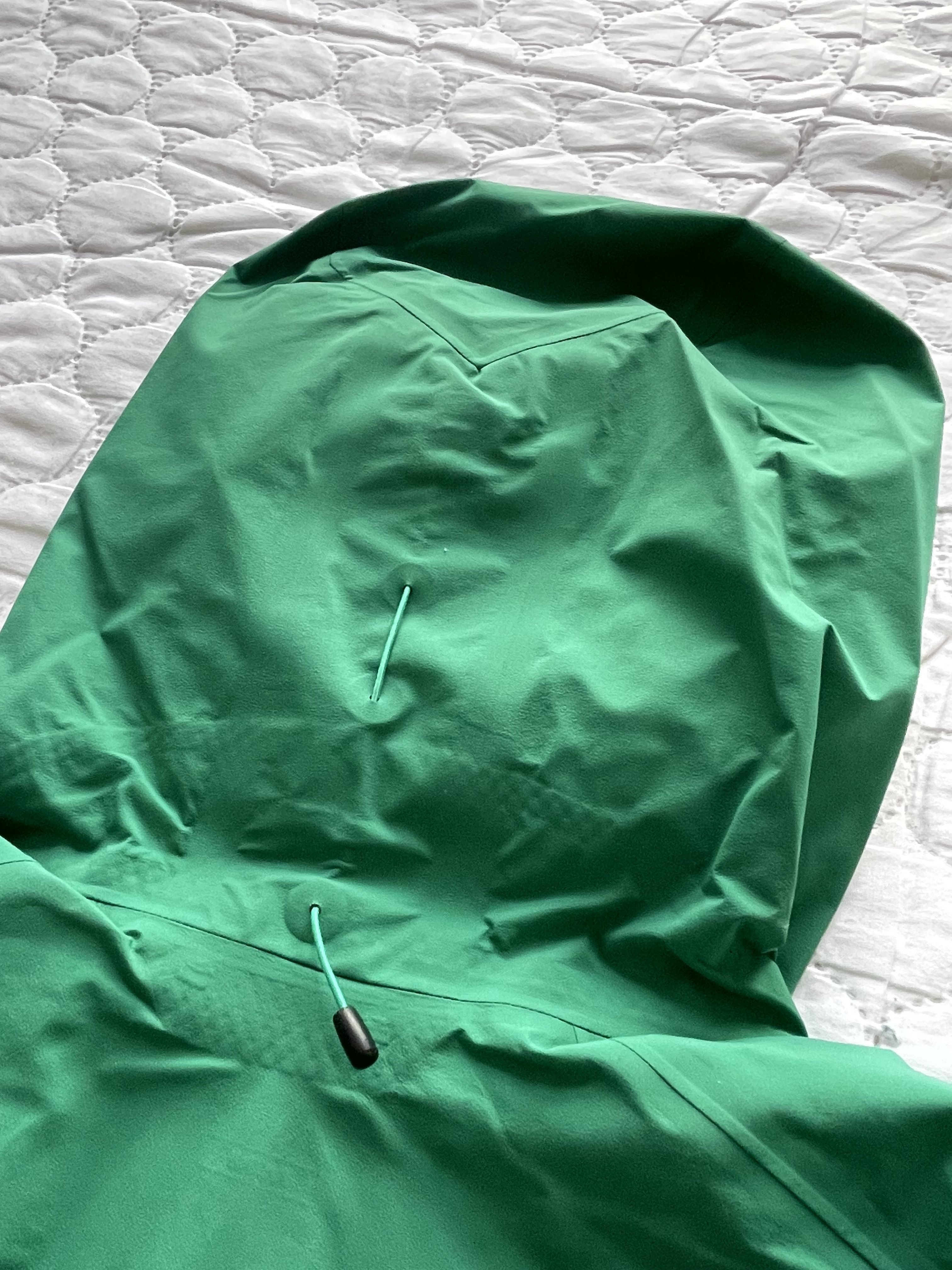 3-layer Gore-Tex active, fully taped seams, waterproof zippers, two hand pockets, elasticated cuffs. Hood large enough to fit over helmet, or can be cinched down without. Packs down really quite small (easily into a bumbag).