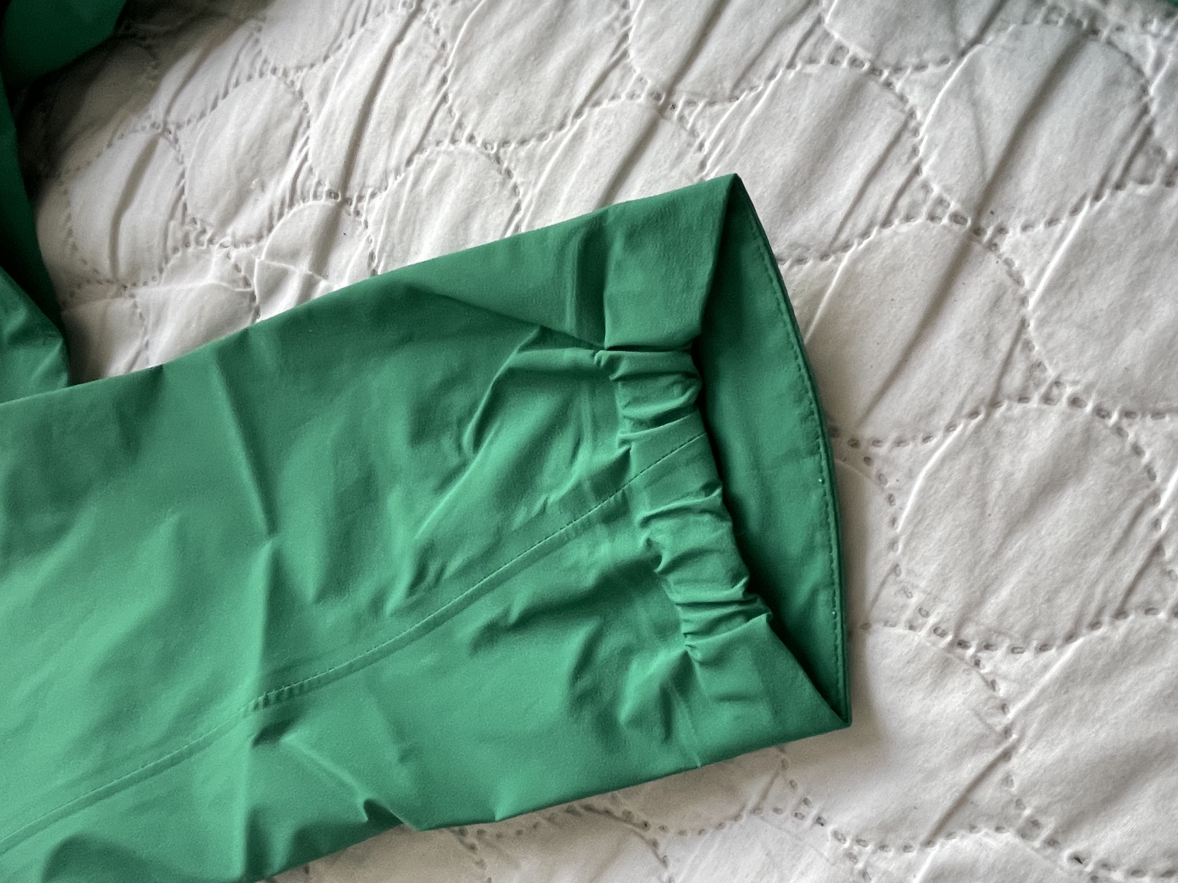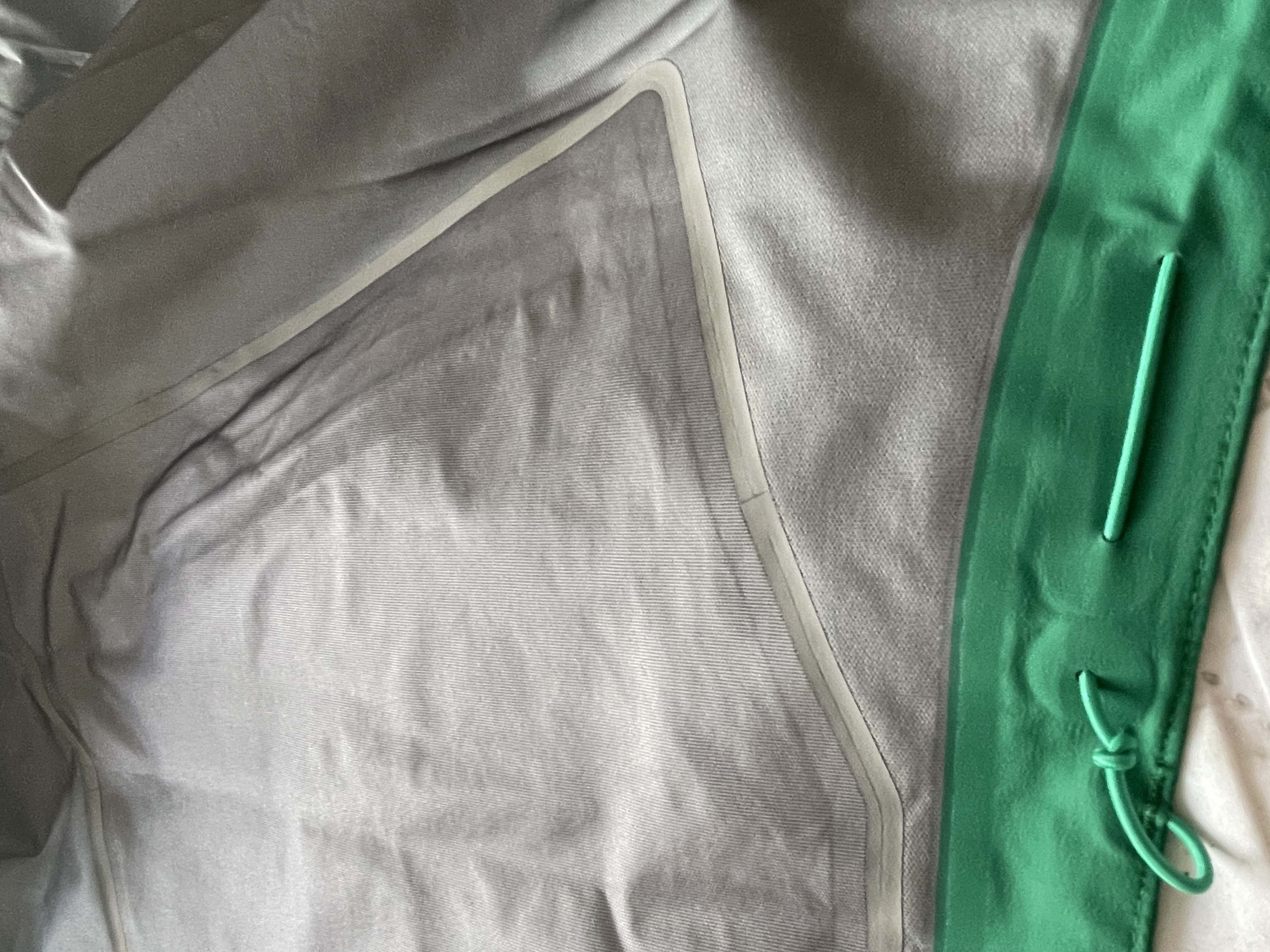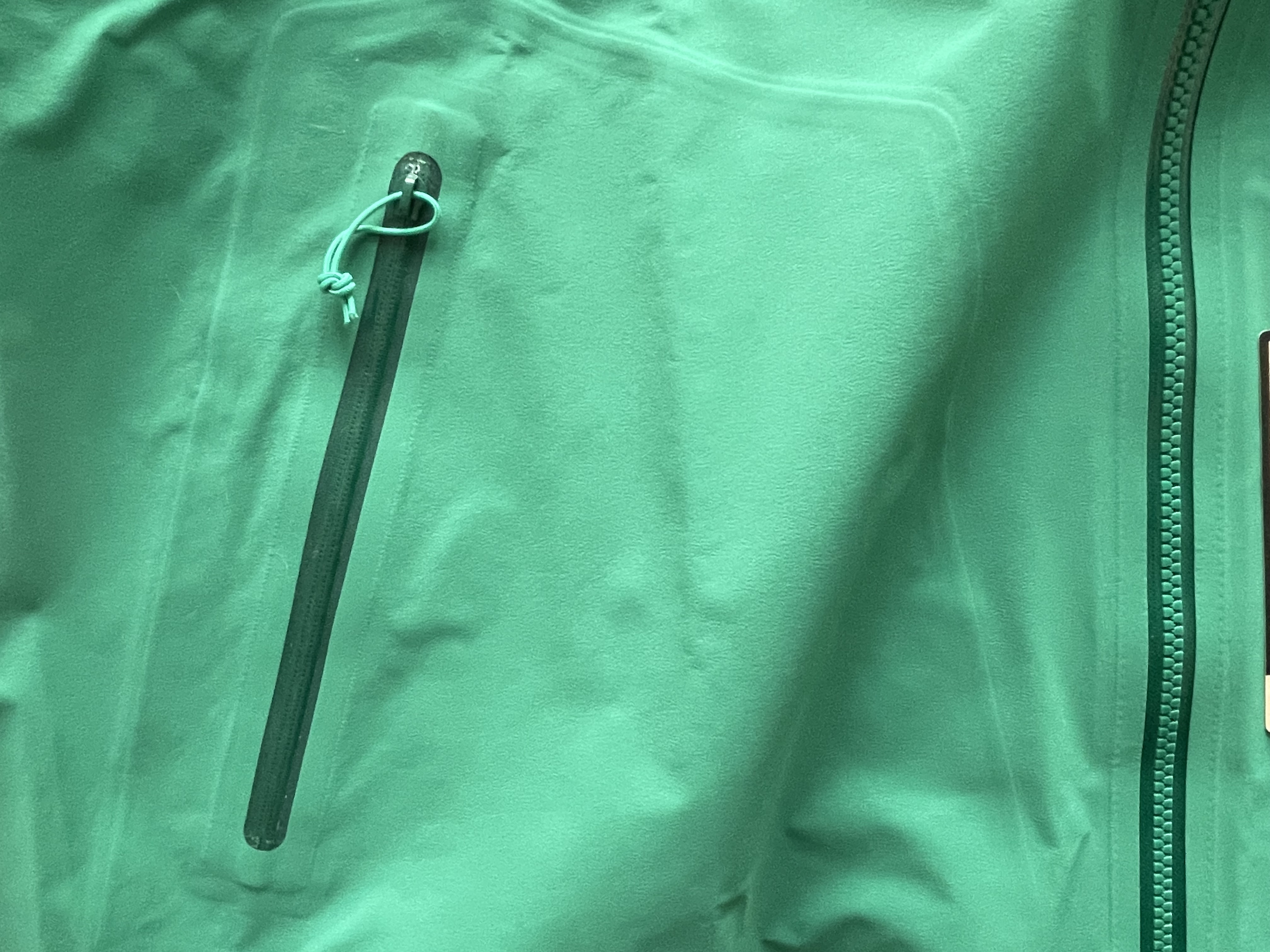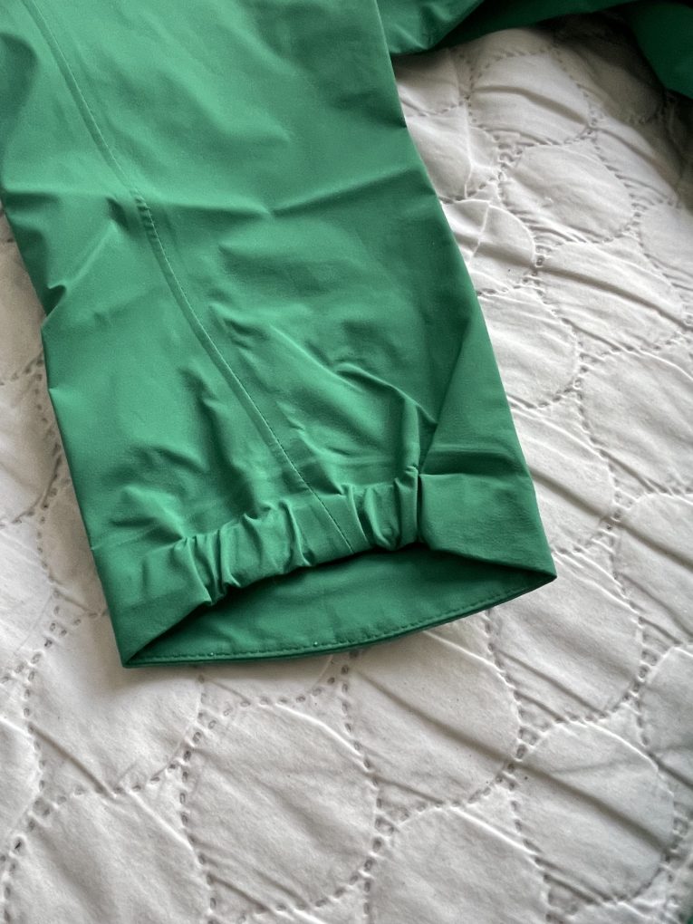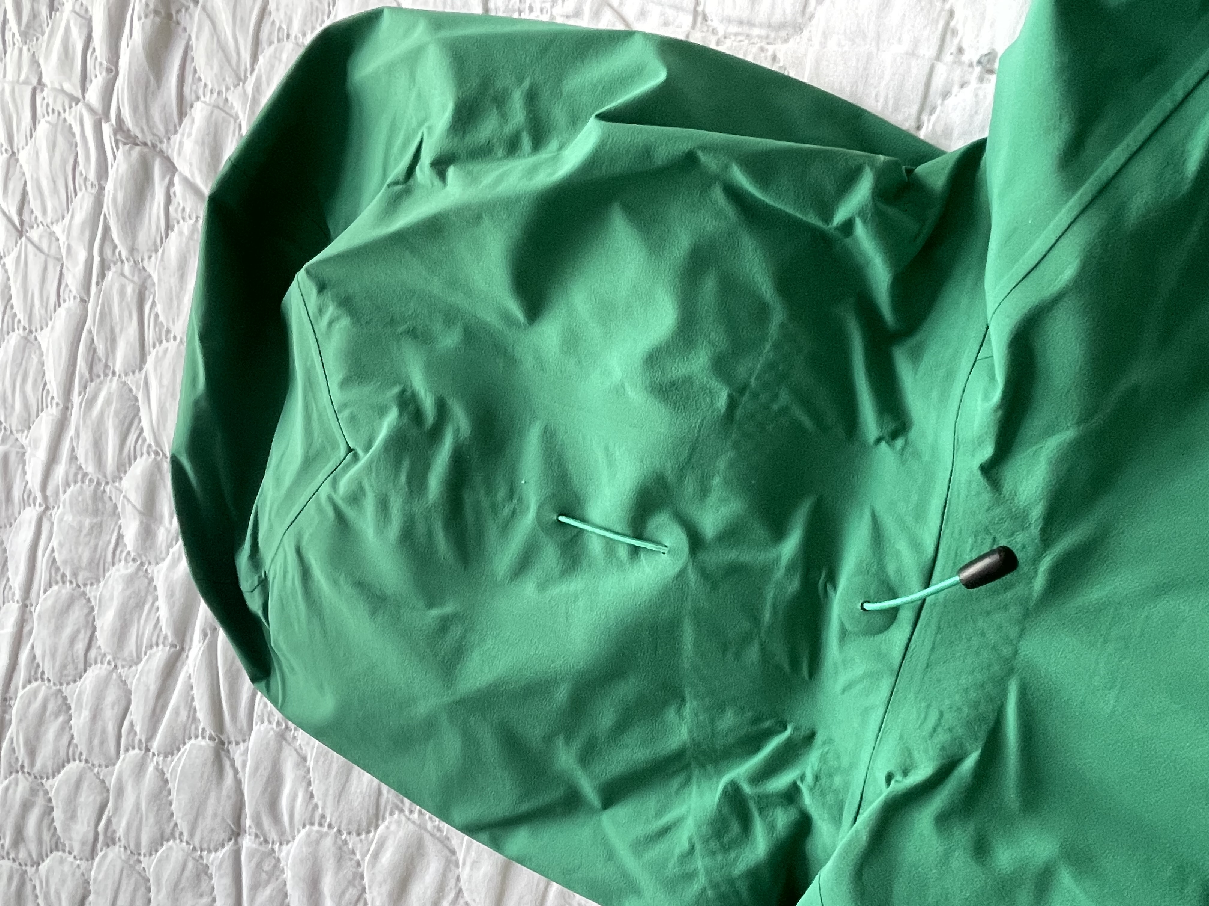 3-layer Gore-Tex active, fully taped seams, waterproof zippers, two hand pockets, elasticated cuffs. Hood large enough to fit over helmet, or can be cinched down without. Packs down really quite small (easily into a bumbag).